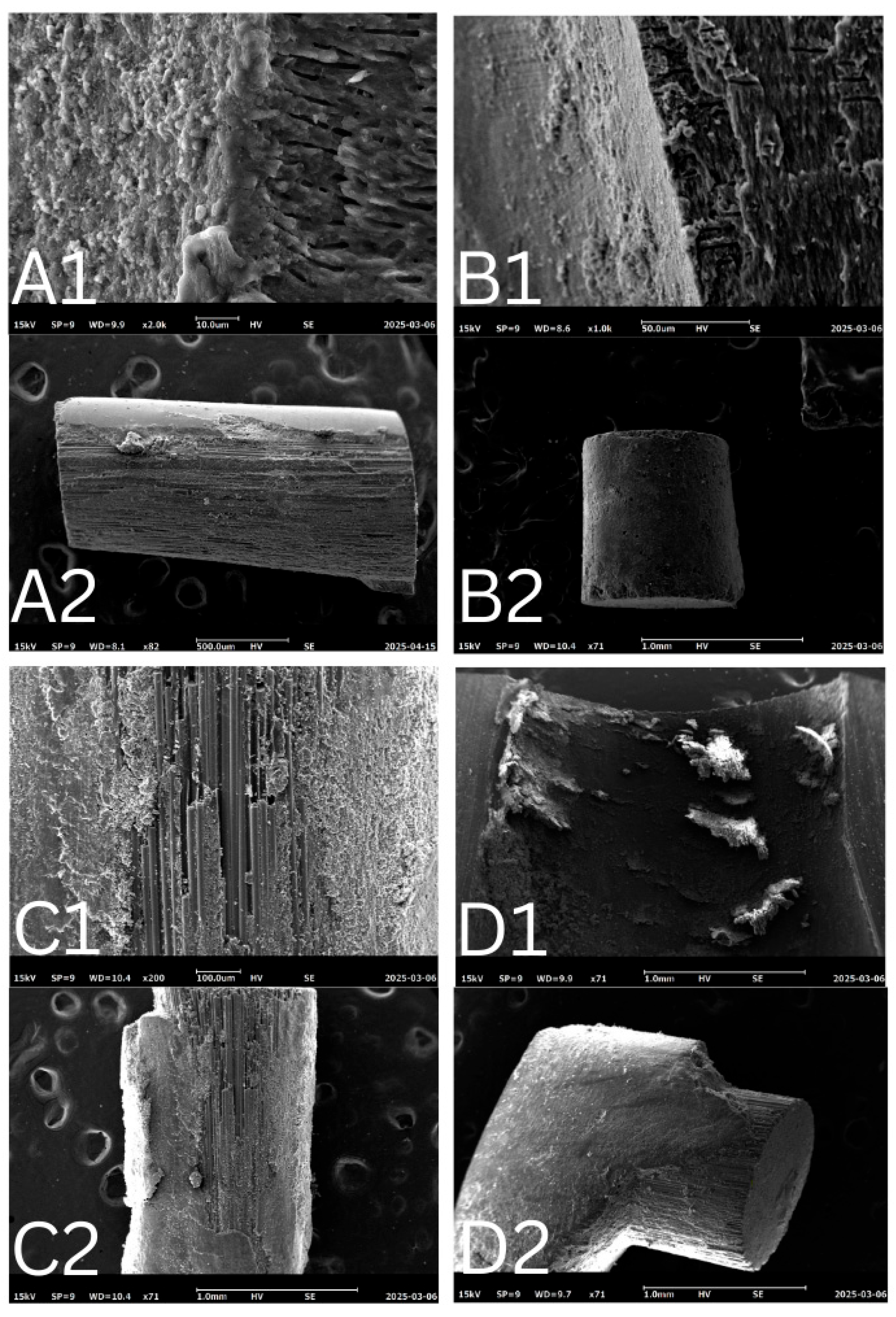 Figure 8 illustrates various failure modes, capturing all types of failures on the dentin and failed post surfaces using a stereomicroscope (OPTIKA Stereomicroscopes, Ponteranica, Italy).
