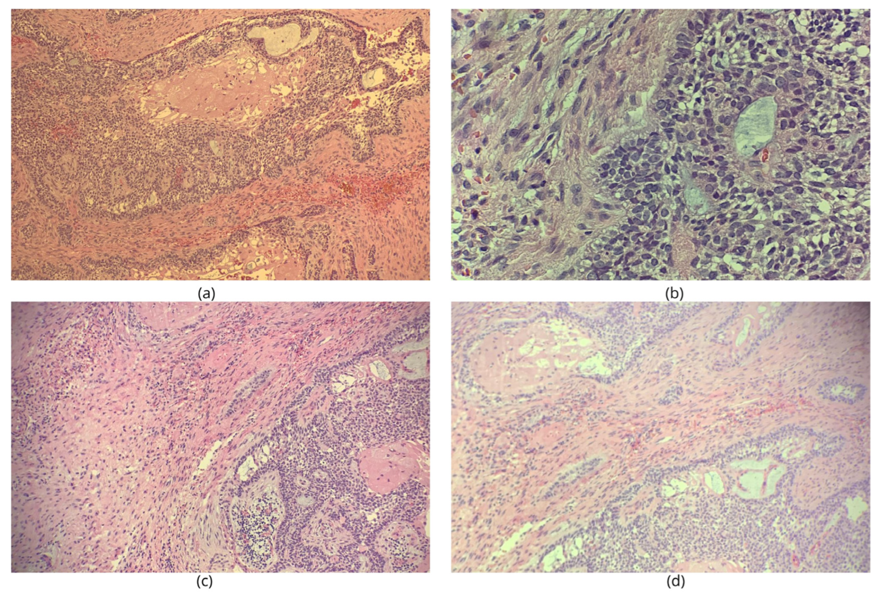 - Morice, A.; Neiva, C.; Fabre, M.; Spina, P.; Jouenne, F.; Galliani, E.; Vazquez, M.P.; Picard, A. Conservative management is effective in unicystic ameloblastoma occurring from the neonatal period: A case report and a literature review. Oral Surg. Oral Med. Oral Pathol. Oral Radiol. 2020, 129, e234–e242. [Google Scholar] [CrossRef] [PubMed]