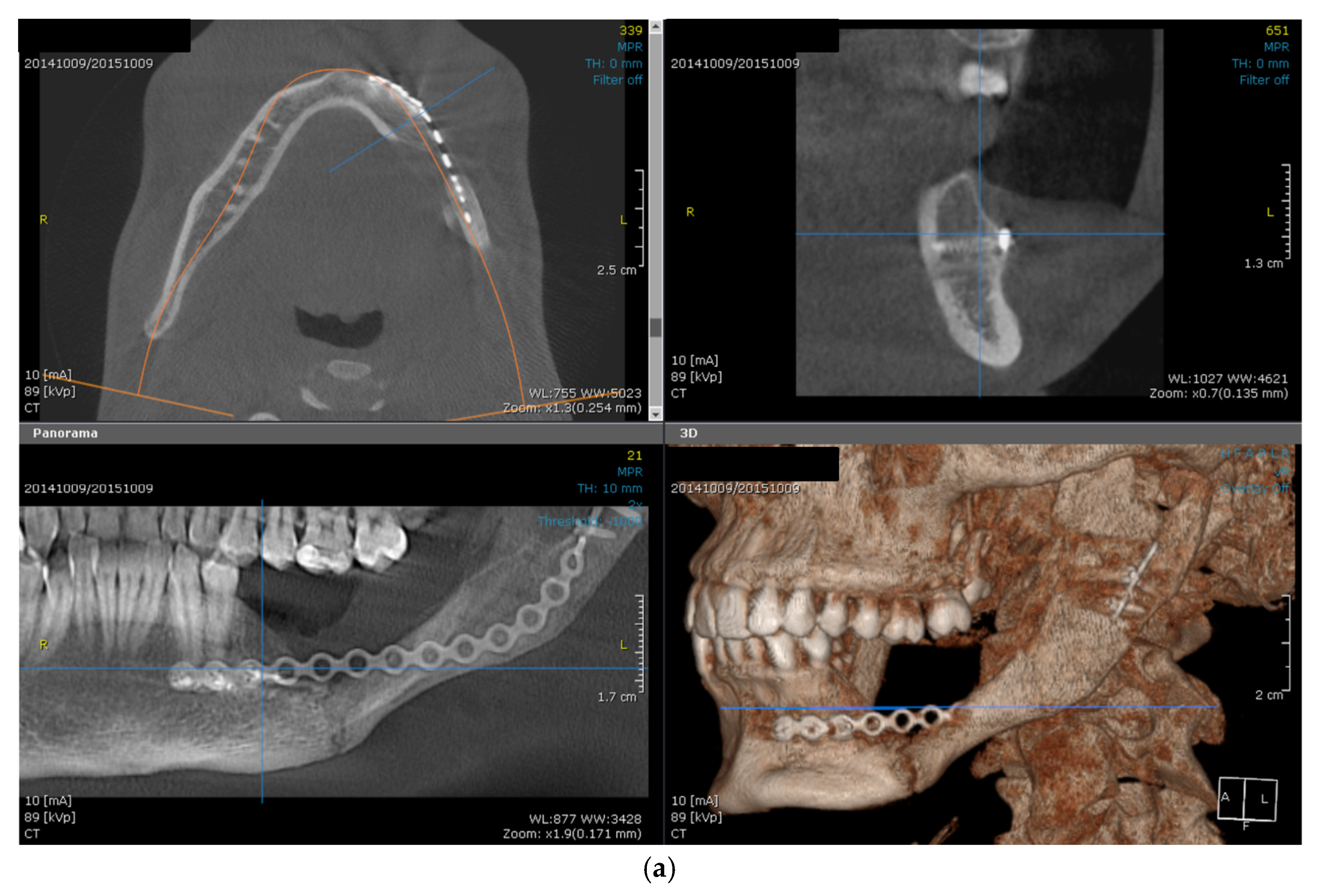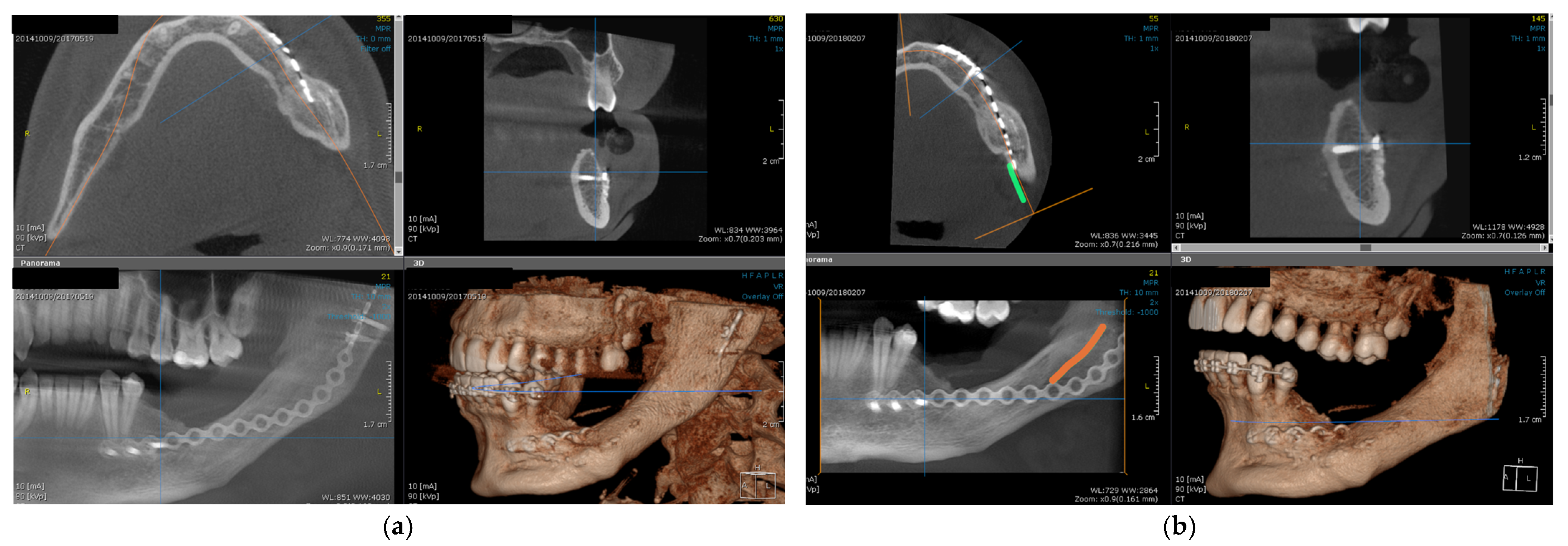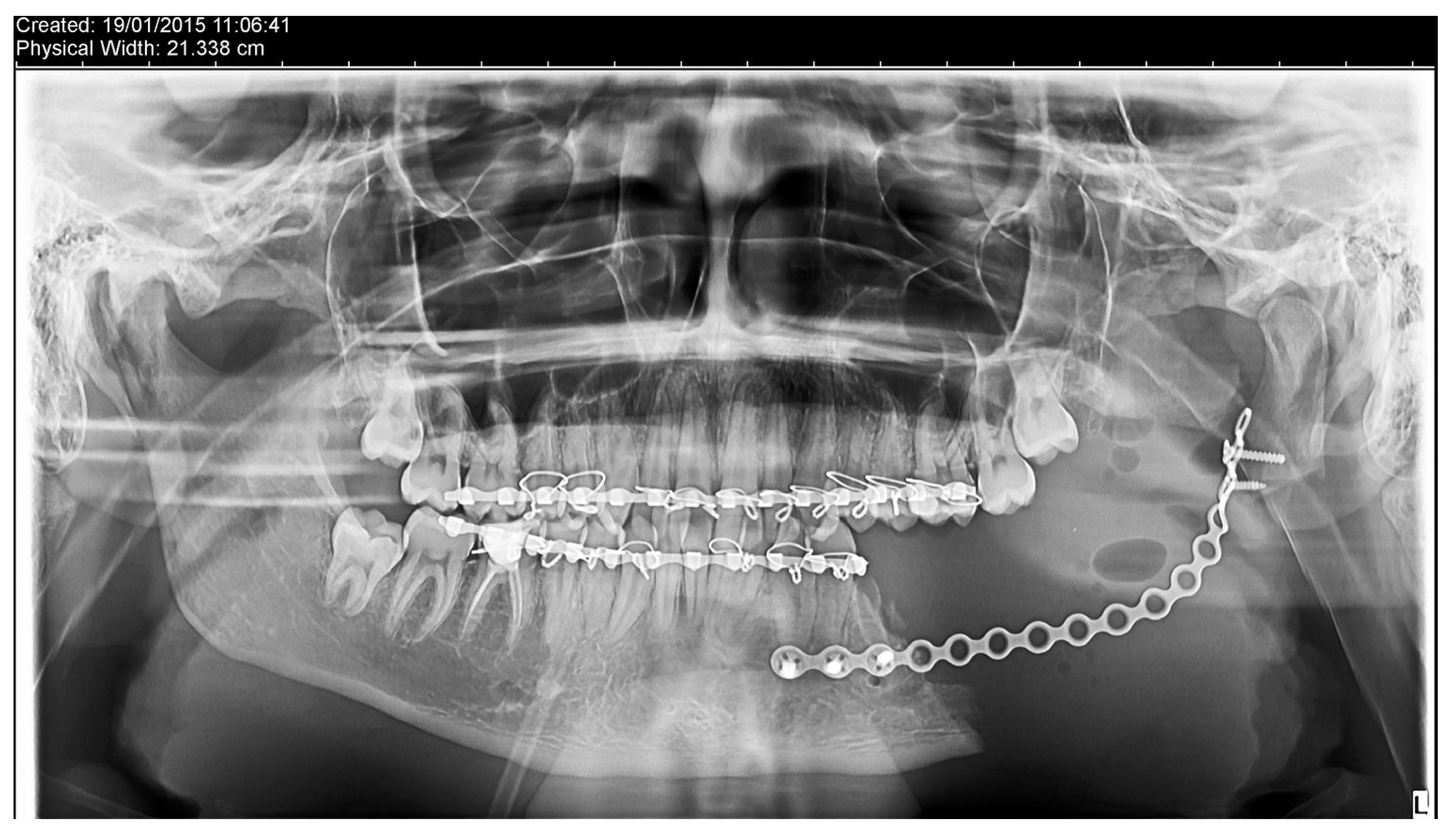 - Radwan, D.; Mobarak, F. Plate-related complications after mandibular reconstruction: Observational study osteotomy. Egypt. J. Oral Maxillofac. Surg. 2018, 9, 22–27. [Google Scholar] [CrossRef]
