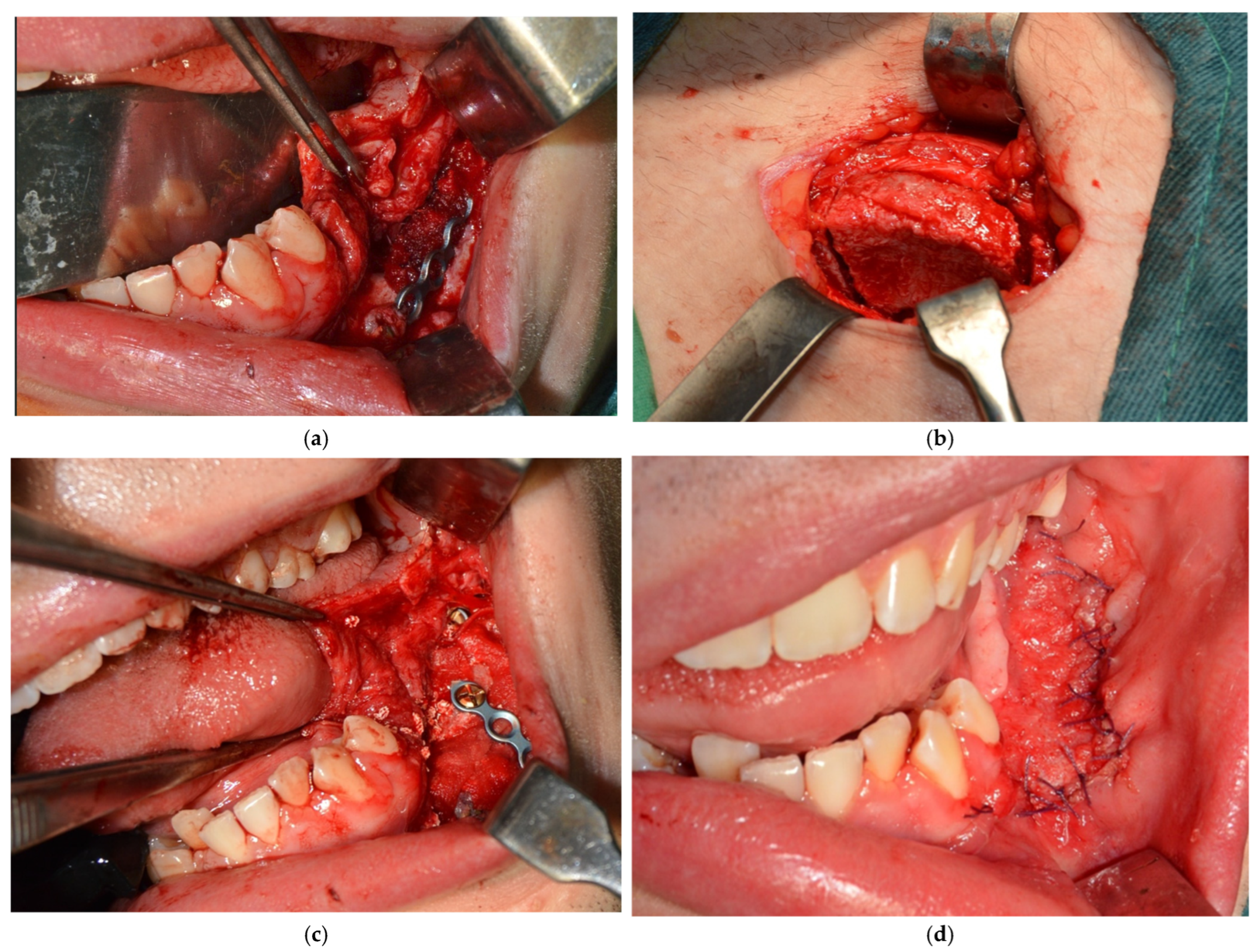 - Kim, A.; Kar, K.; Nowzari, H.; Cha, H.S.; Ahn, K.M. Immediate free iliac bone graft after nonsegmental mandibular resection and delayed implant placement: A case series. Implant Dent. 2013, 22, 438–443. [Google Scholar] [CrossRef]