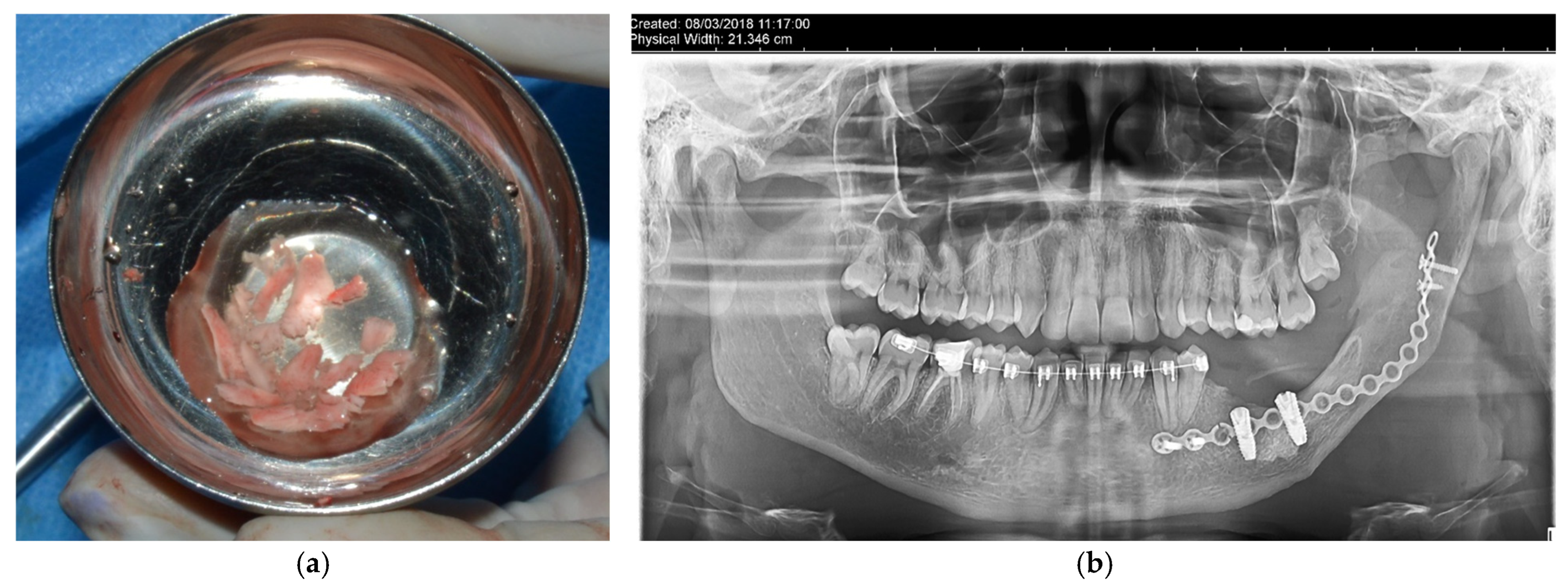 - Lustosa, R.; Macedo, D.; Cristina, L.; Iwaki, L.; Tolentino, E.; Hasse, P.; Bruno, G.; Marson, O.; Liogi, I.; Filho, L. Continuity resection of the mandible after ameloblastoma e feasibility of oral rehabilitation with rhBMP-2 associated to bovine xenograft followed by implant installation. J. Craniomaxillofac. Surg. 2015, 43, 1553–1560. [Google Scholar] [CrossRef]