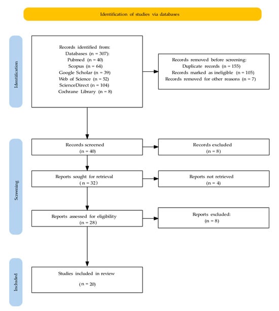 The database searches retrieved a total of 307 studies, of which 40, 64, 39, 52, 104 and 8 studies were retrieved from the PubMed, Scopus, Google Scholar, Web of Science (via web search), ScienceDirect (via web search), and Cochrane Library (via web search) databases, respectively.