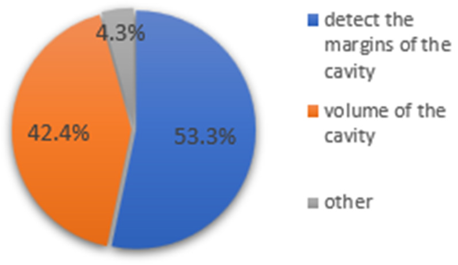 Out of 92 participants who answered the question “in which part of the diagnostic procedure you were helped the most by fluorescence”, 49 (53.3%) used fluorescence to define the margins of the cavity more clearly, and 39 (42.4%) used fluorescence to detect the volume of the cavity, whereas 4 (4.3%) could not state in what part they were helped (
