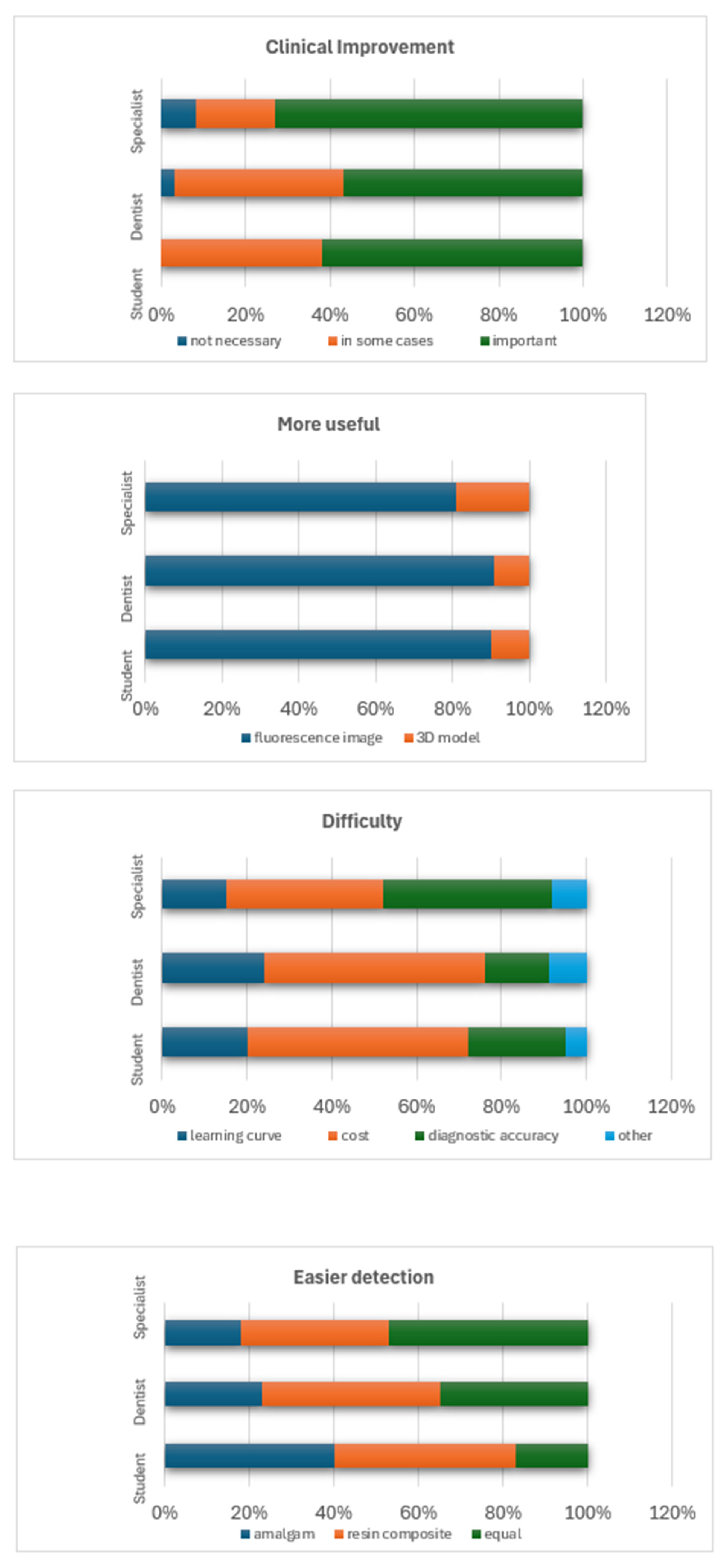 10], existing studies are primarily limited to the technical validation of diagnostic tools in vitro or under controlled clinical conditions, focusing on sensitivity, specificity, and imaging properties. In contrast, the current study evaluates the subjective perception and usability of fluorescence-enhanced 3D imaging among dental students and clinicians, thereby expanding upon our previous systematic review of fluorescence and NIR for secondary caries detection [