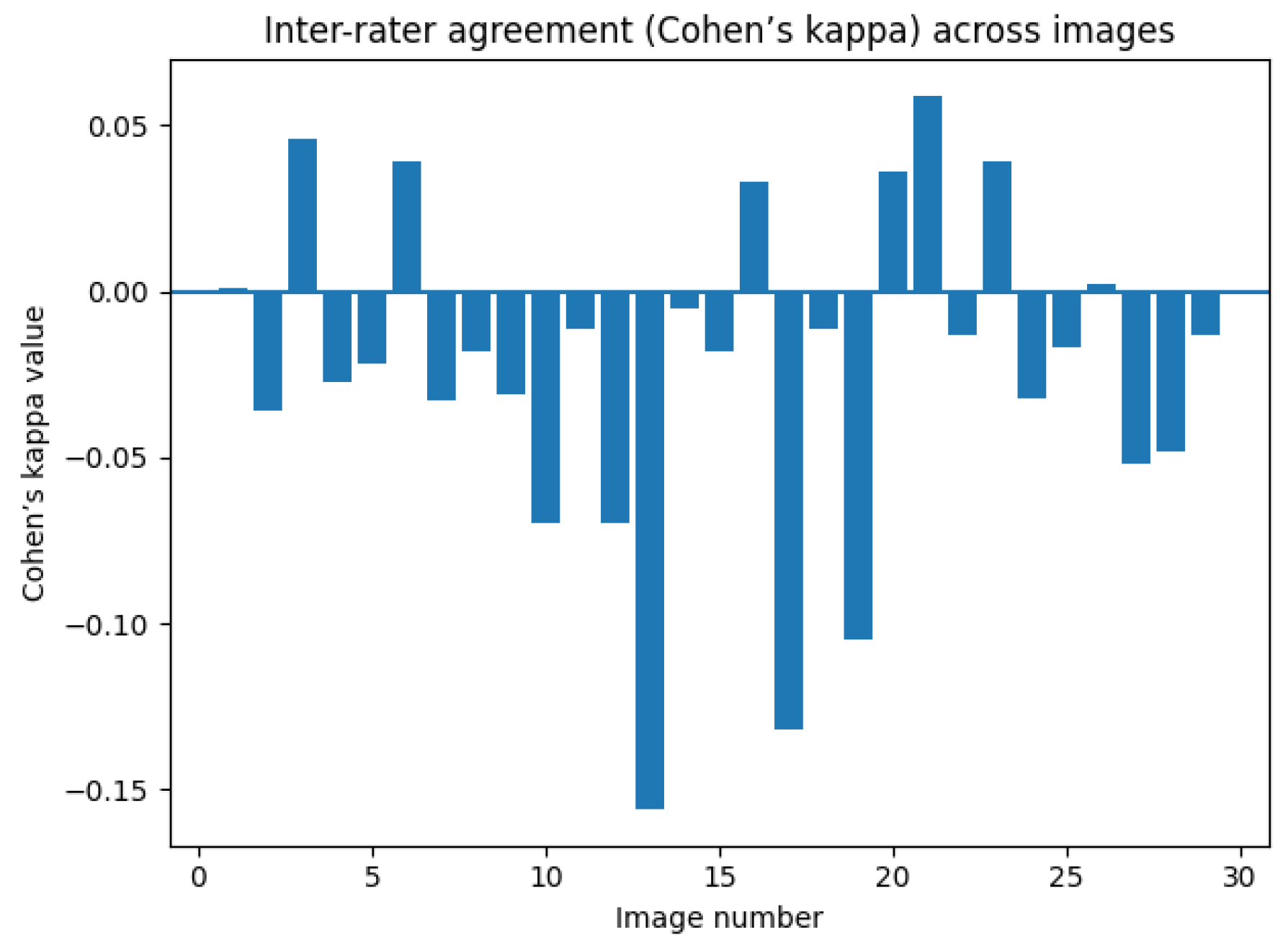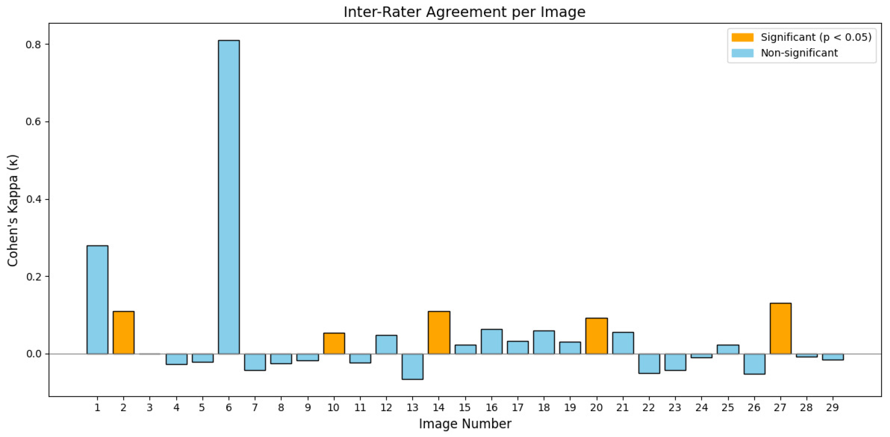 Figure 9, demonstrating predominantly low kappa values across all images. Inter-rater agreement across participants was generally poor. Cohen’s kappa values for most images were close to zero or negative, indicating minimal agreement beyond chance. 5 of 29 images had k values that reached statistical significance, all within the weak agreement range (κ = 0.05–0.13). Only a limited number of images demonstrated weak but statistically significant agreement, and one image showed high κ (0.81) without reaching significance.