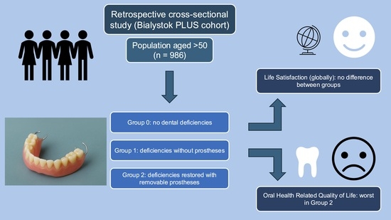 Wnorowska, K.; Dębkowska, K.; Borawska, Z.; Samietz, S.; Bagińska, J.; Kamińska, I.; Dubatówka, M.; Stachurska, Z.; Sowa, P.; Kamiński, K.A.; et al. Prosthetic Status, Removable Prostheses and Quality of Life in Older Adults: A Retrospective Cross-Sectional Analysis Within a Population-Based Study. Dent. J. 2026, 14, 7. https://doi.org/10.3390/dj14010007