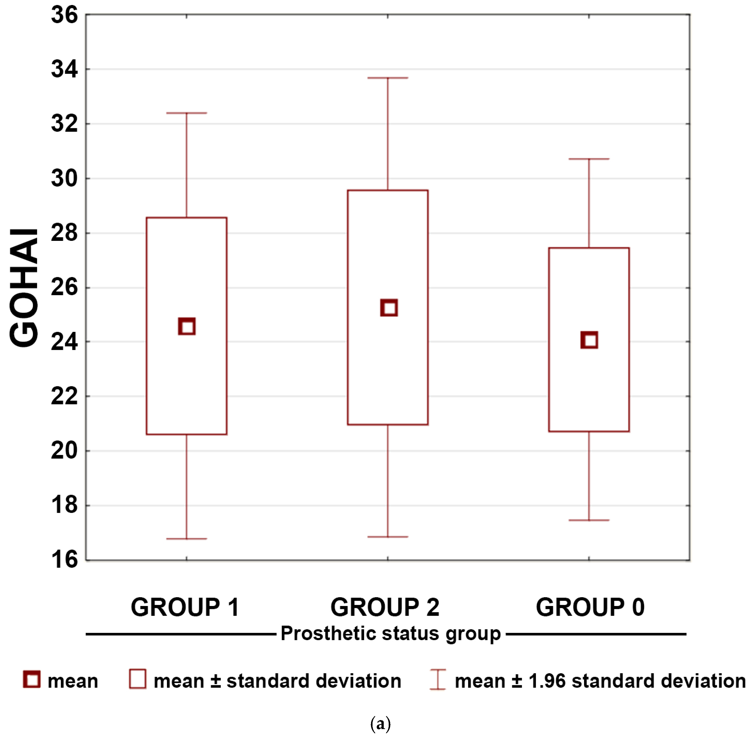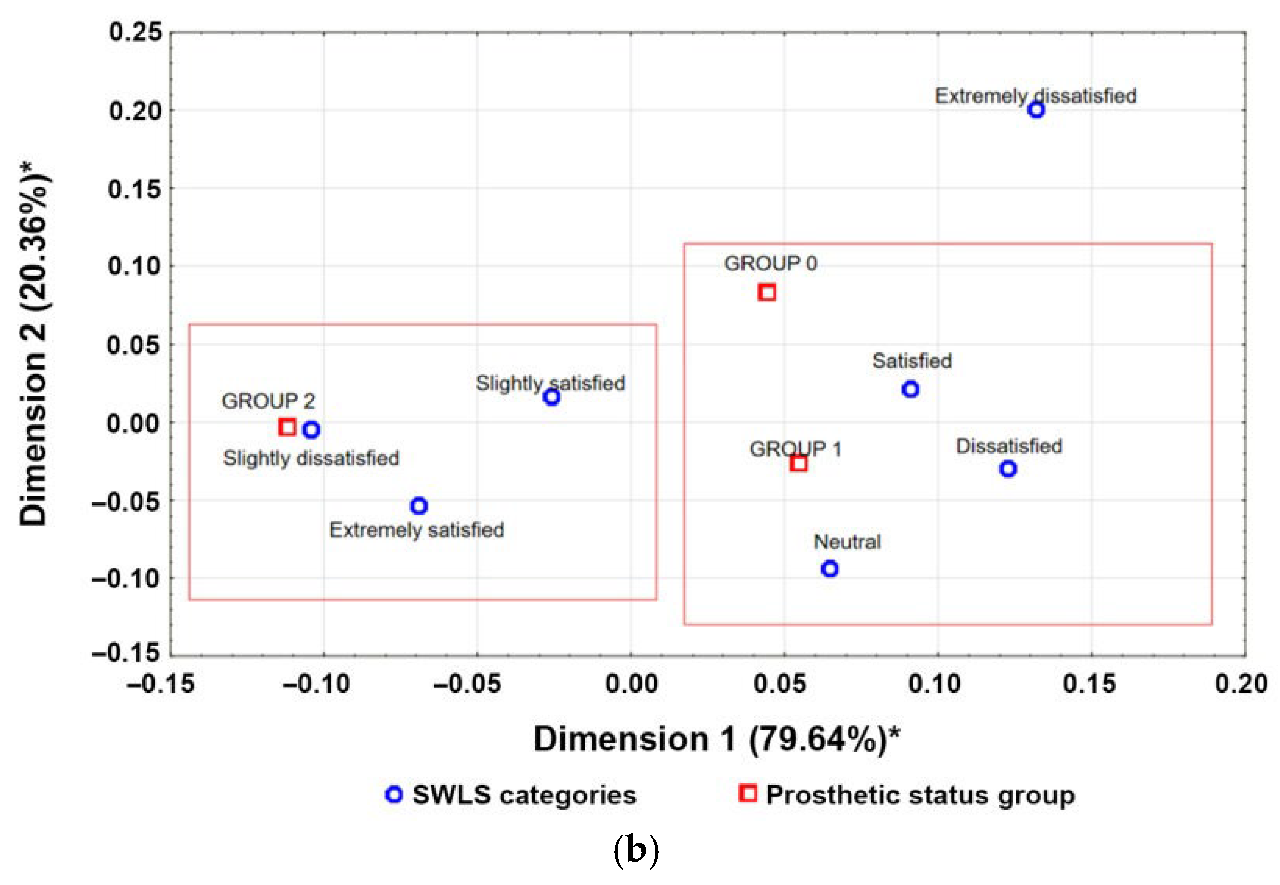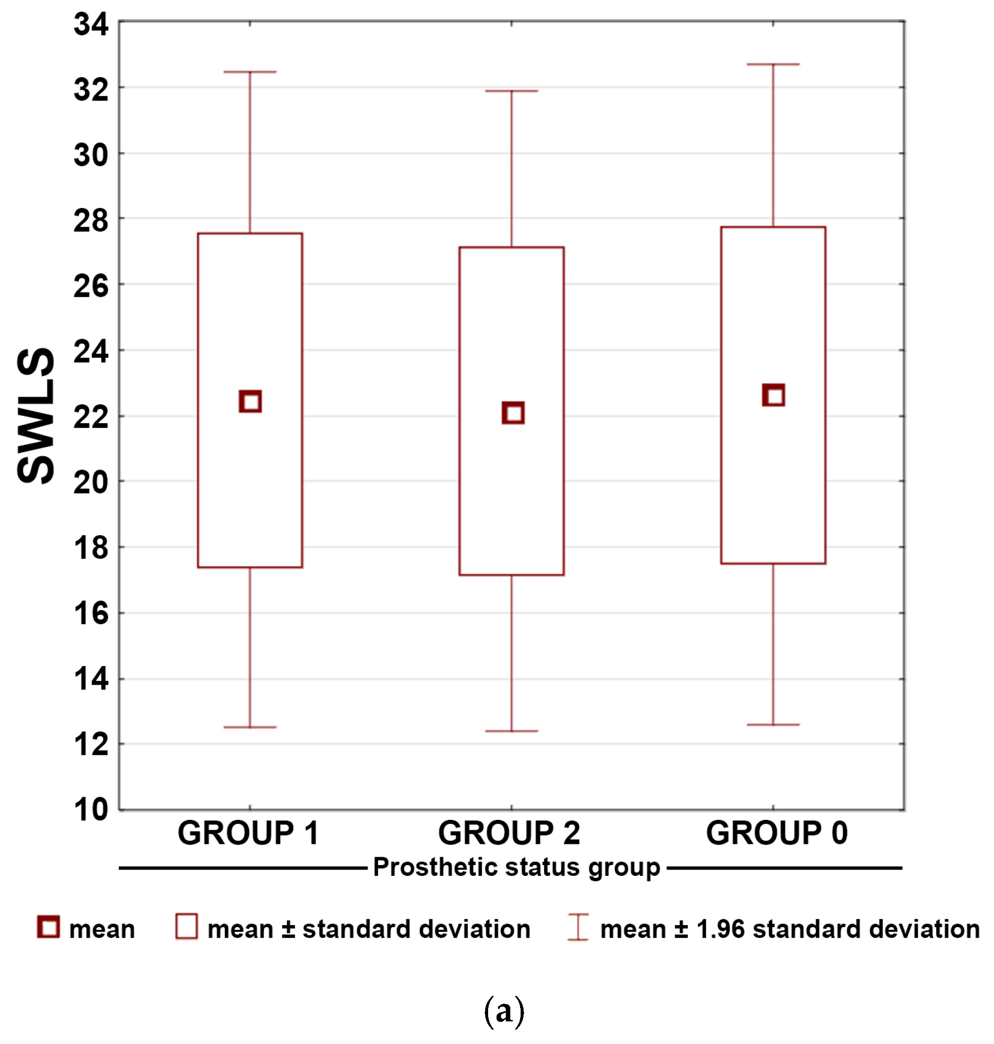 - Life satisfaction remained stable across all prosthetic groups, indicating that global well-being is not influenced by dental status or prosthesis use.