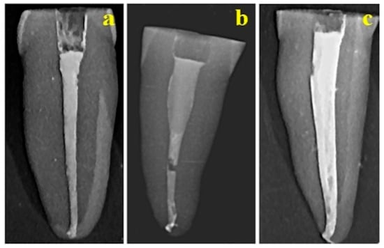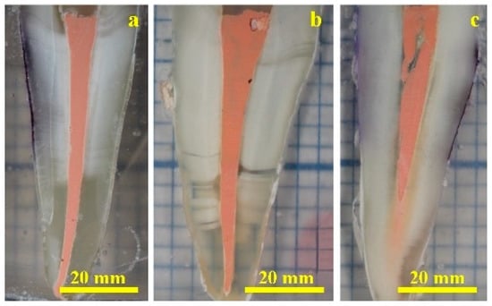 b. The root canal obturation. The sample of 60 teeth was randomly divided into three groups (n = 20). Each tooth of these groups was endodontically obturated using an epoxy resin-based sealer, the AH Plus Jet (Dentsply De Trey GmbH, Konstanz, Germany), and 3 filling techniques: single cone (SC), warm vertical condensation (WVC), and lateral compaction (LC).
