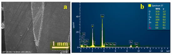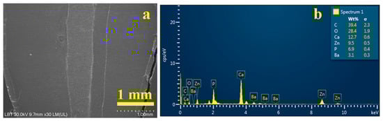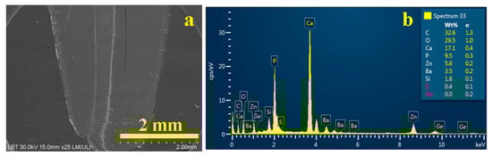 The EDX spectrum in Figure 6b indicates that C and O are dominant, partly due to the organic material of gutta-percha and the cement used, closely followed by Ca and P, which are key indicators of the presence of hydroxyapatite in dentin. The amounts of Zn and Ba detected correspond to the gutta-percha, being related to barium sulfate and zinc oxide. Sulfur, which appears in relatively small quantities compared to the other elements, is below the detection limit of the WVC method.