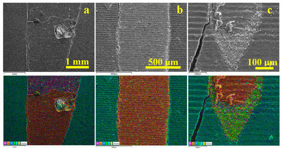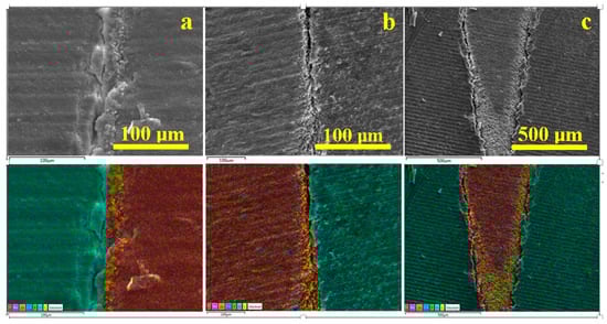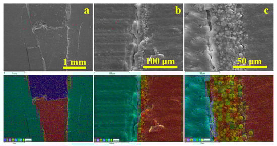 SEM images of backscattered electrons with the distribution map of the constituent elements of the main areas of the filling performed using the LC method: (a) coronal, (b) medial, and (c) apical.