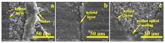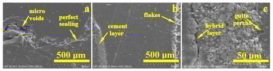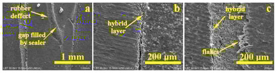 Figure 11a highlights the microstructural details of the defect in the coronal part of the gutta-percha cone. It is very clear that its rubber mass was most likely torn accidentally by the endodontic instrument used to insert the cone into the canal. This tear has an upward trajectory, but fortunately, the endodontic sealer penetrated well into the cavity formed, perfectly sealing the entrance to the torn area, which contributes to the success of the filling’s tightness. Figure 11b,c show the increase in thickness of the endodontic sealer layer, as well as its perfect adhesion to the dentin wall through the hybrid layer and to the gutta-percha cone through excellent molding of the filler particles perfectly laminated by the polymer matrix.