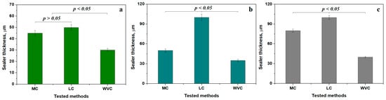 Variation in the mean thickness of the sealing layer for each tested method: (a) SC, (b) LC and (c) WVC.
