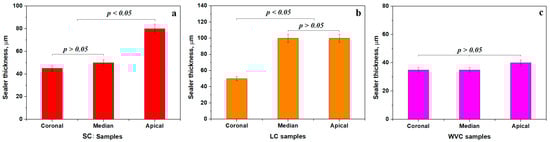Variation of the mean thickness of the sealing layer for the targeted areas: (a) coronal, (b) median, and (c) apical.