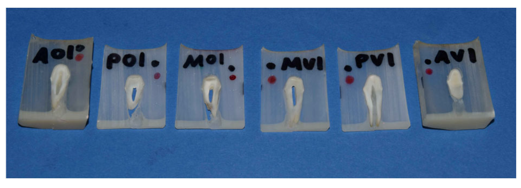 Figure 1). Throughout the entire process of preparing and evaluating the tooth sections—from embedding and cutting to microscopic examination—markings were used on the samples to ensure accuracy in terms of tooth side and orientation.