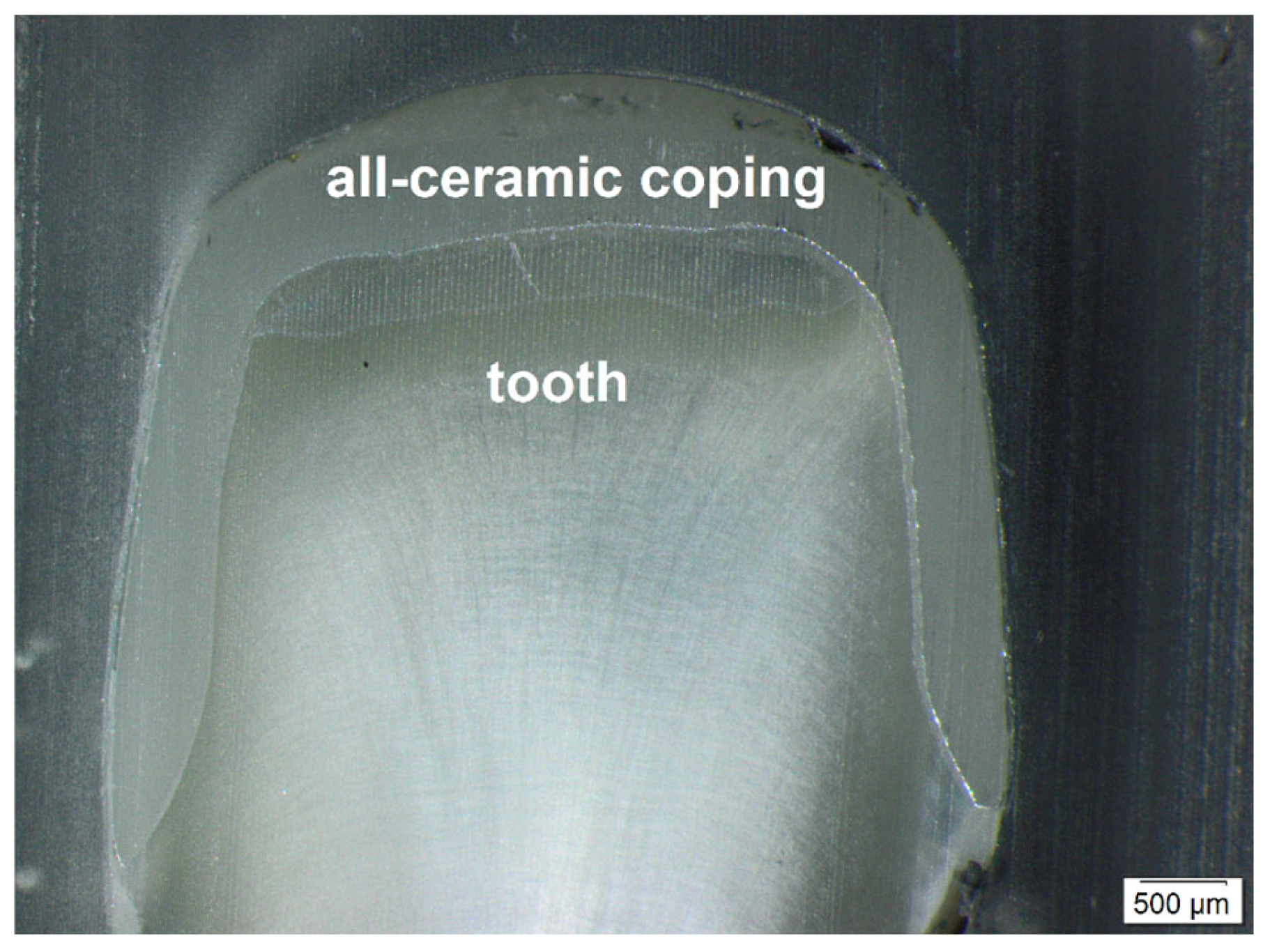 26]. The authors are unaware of investigations using the presented method of preparing slices of embedded real teeth with crown copings for the examination of the marginal fit. A method like the frequently used replica method [