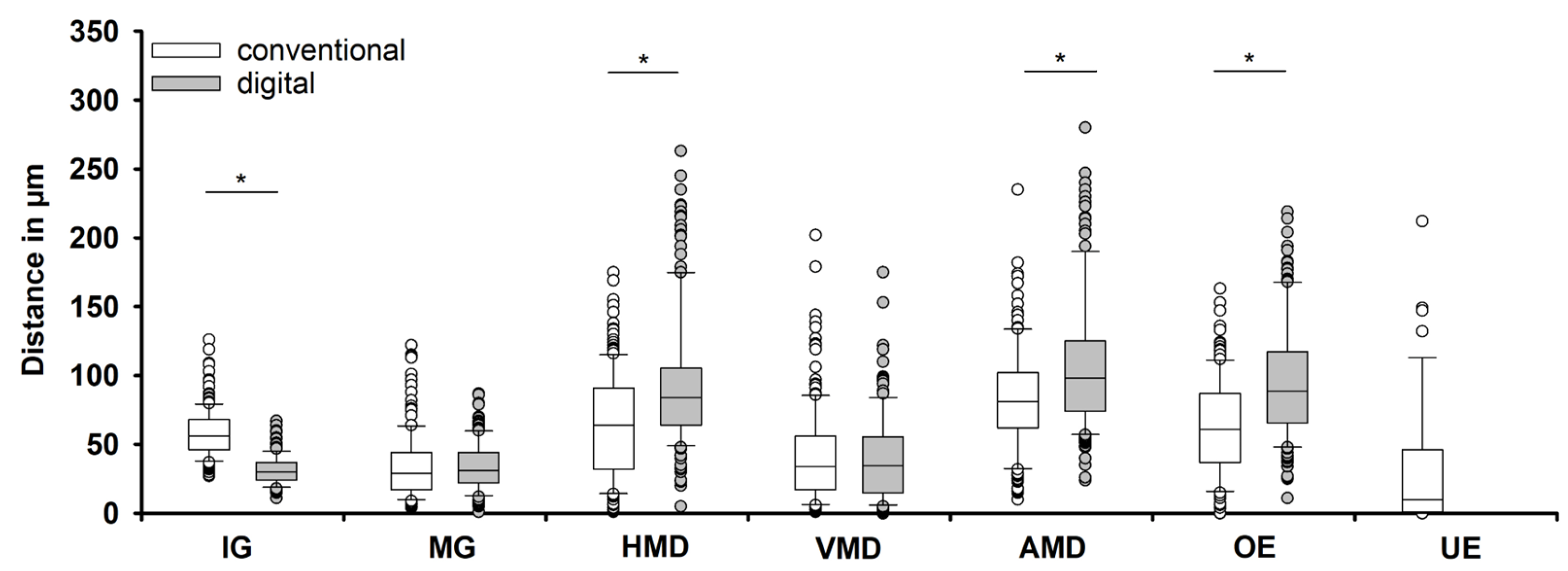 The absolute marginal discrepancy is a combination of the marginal gap and the extension. Due to the overextension of all copings based on digital impression, the absolute marginal discrepancy had a larger median value (98 μm) compared to the conventional method (81 μm). Other in vitro studies, as well as meta-analyses found marginal discrepancies between 48 μm [