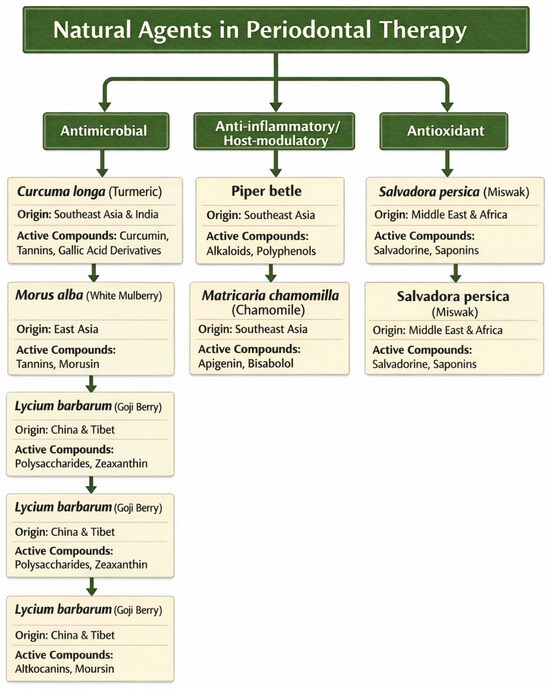 - Gawish, A.S.; ElMofty, M.S.; Jambi, S.; Felemban, D.; Ragheb, Y.S.; Elsayed, S.A. Phytotherapy in periodontics as an effective and sustainable supplemental treatment: A narrative review. J. Periodontal Implant Sci. 2024, 54, 209–223. [Google Scholar] [CrossRef] [PubMed]