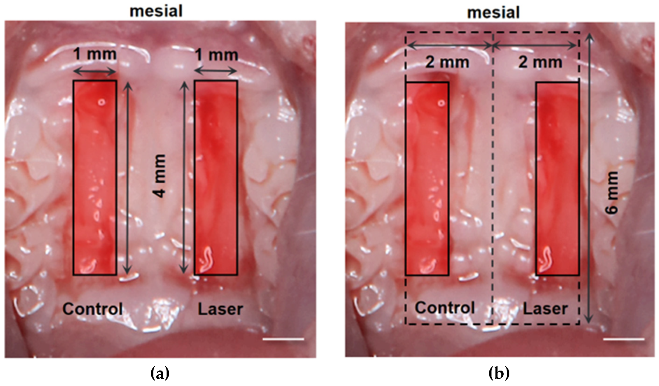 - Zhong, J.; Zhang, X.; Ruan, Y.; Huang, Y. Photobiomodulation Therapy’s Impact on Angiogenesis and Osteogenesis i n Orthodontic Tooth Movement: In Vitro and in Vivo Study. BMC Oral. Health 2024, 24, 147. [Google Scholar] [CrossRef] [PubMed]