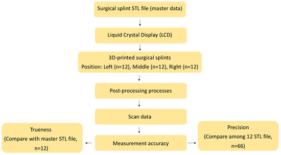 The 3D-printed surgical splints were lightly coated with anti-reflective spray (Renfert Scan Spray, Renfert USA, Illinois, IL, USA). A consistent scanning protocol and scanning path were applied for all specimens, and anti-reflective spray was applied uniformly before scanning. All surgical splints were scanned using the same laboratory optical scanner (E3, 3Shape, Copenhagen, Denmark). The scan data were saved and exported as STL files (experimental data).