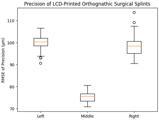 Box plot showing the distribution of precision (RMSE, μm) of LCD-printed orthognathic surgical splints fabricated at different printing positions on the build platform. The middle printing position demonstrated significantly lower RMSE values compared with the left and right positions (one-way ANOVA with Tukey HSD post hoc test, p < 0.001), whereas no significant difference was observed between the left and right positions.
