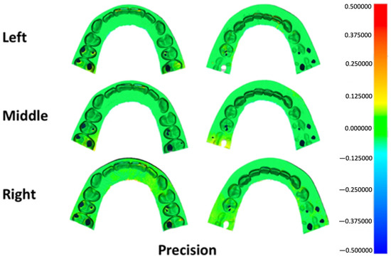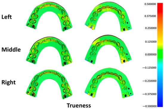 In accordance with ISO 5725-1 (International Organization for Standardization: Geneva, Switzerland; 1994.), accuracy was decomposed into trueness and precision components. Trueness was calculated by superimposing individual printed splints onto the master STL reference (12 datasets per position). Precision was derived from pairwise intra-group alignments among splints fabricated at the same platform location, yielding 66 comparisons per group.