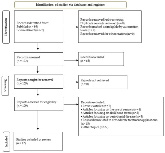 Study selection was conducted in accordance with predefined inclusion and exclusion criteria. Eligible studies were required to employ FEA as the primary methodological approach, focus on orthodontic treatments involving clear aligners or fixed appliances, and present in silico simulations addressing biomechanical aspects such as force distribution, stress analysis, or tooth movement. Only studies that evaluated the mechanics of orthodontic treatment without auxiliary anchorage devices (tensoral anchorage devices, mini-implants or extraoral appliances) were included. This decision was made to reduce methodological heterogeneity and isolate the biomechanical effects generated solely by the primary orthodontic appliances. Studies that were exclusively clinical in nature, narrative or systematic reviews, letters to the editor, opinion articles or publications lacking a clear description of the finite element model were excluded. Additionally, studies not related to orthodontic applications or without a computational or biomechanical component were not considered.