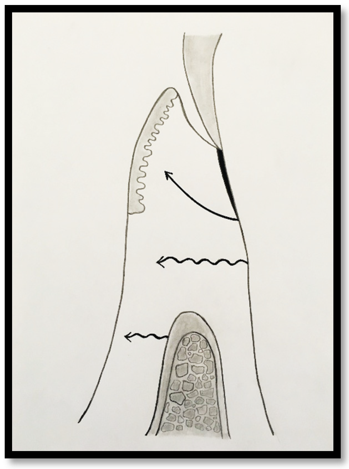 In this condition, the attached gingiva consists primarily of junctional epithelium (JE), with only minimal extension of connective tissue fibers into the coronal portion of the keratinized papilla. Most connective tissue fibers, including supracrestal fibers, course apically and insert into the alveolar mucosa rather than into the keratinized tissue. Consequently, the soft tissue attachment in this configuration exhibits limited mechanical resistance and a reduced capacity to stabilize the gingival margin.