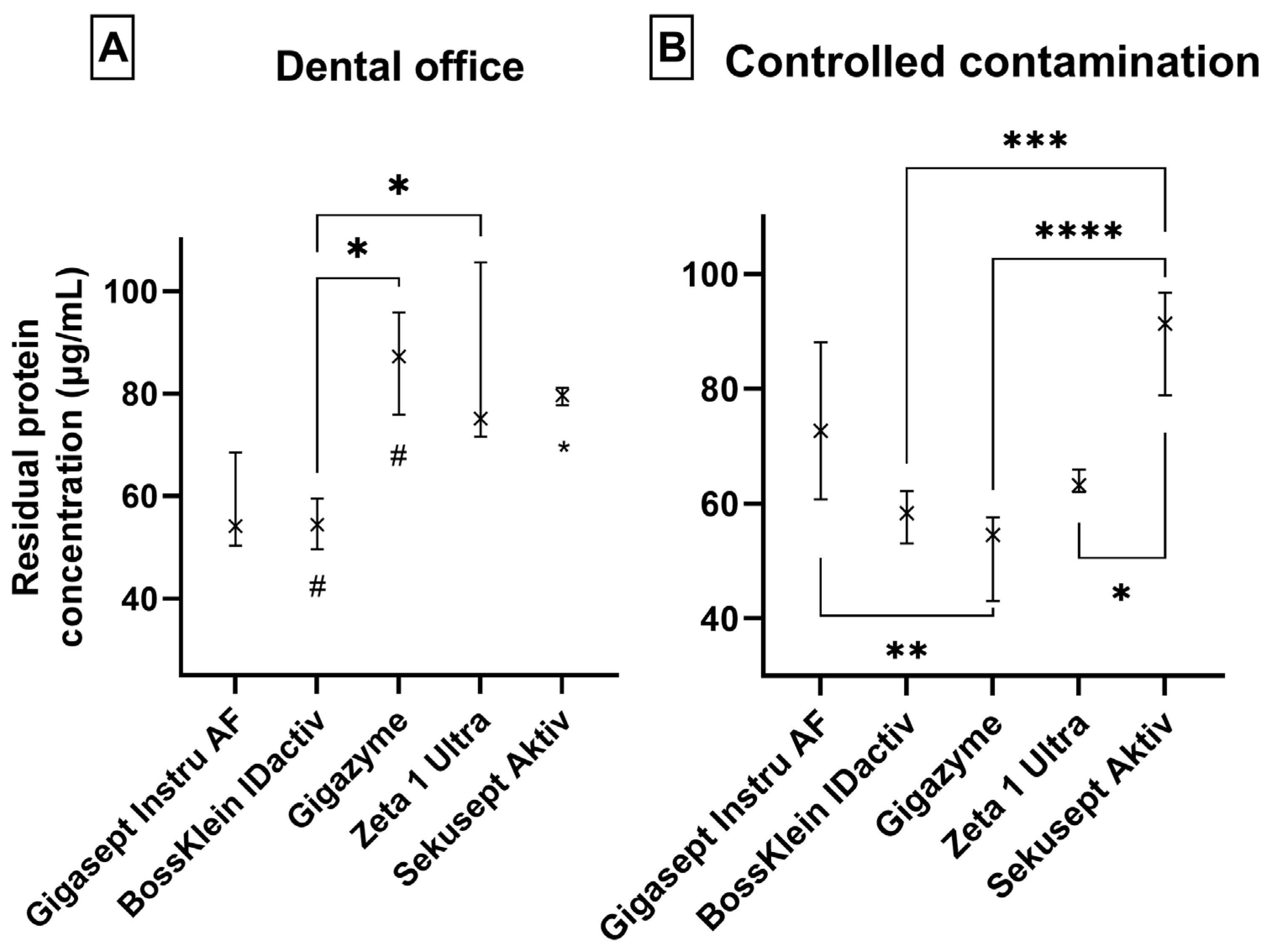 - Smith, A.; Letters, S.; Lange, A.; Perrett, D.; McHugh, S.; Bagg, J. Residual protein levels on reprocessed dental instruments. J. Hosp. Infect. 2005, 61, 237–241. [Google Scholar] [CrossRef] [PubMed]