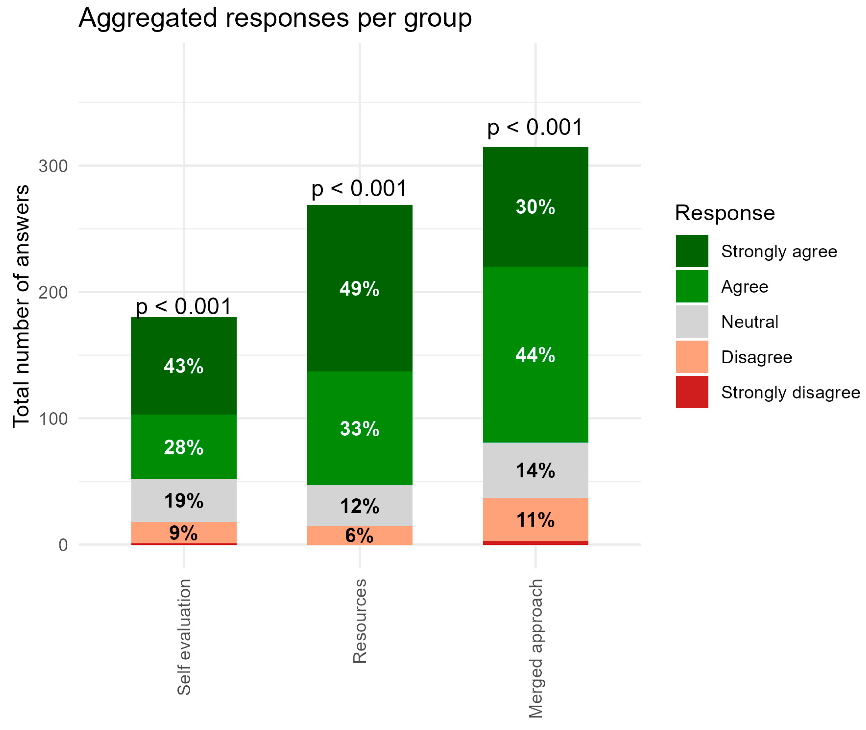 Figure 5 shows “Aggregated responses per group,” illustrating the distribution of responses across the three aspects assessed: self-evaluation, resources, and the merged approach. Across all groups, positive responses (Agree + Strongly Agree) constituted the majority (