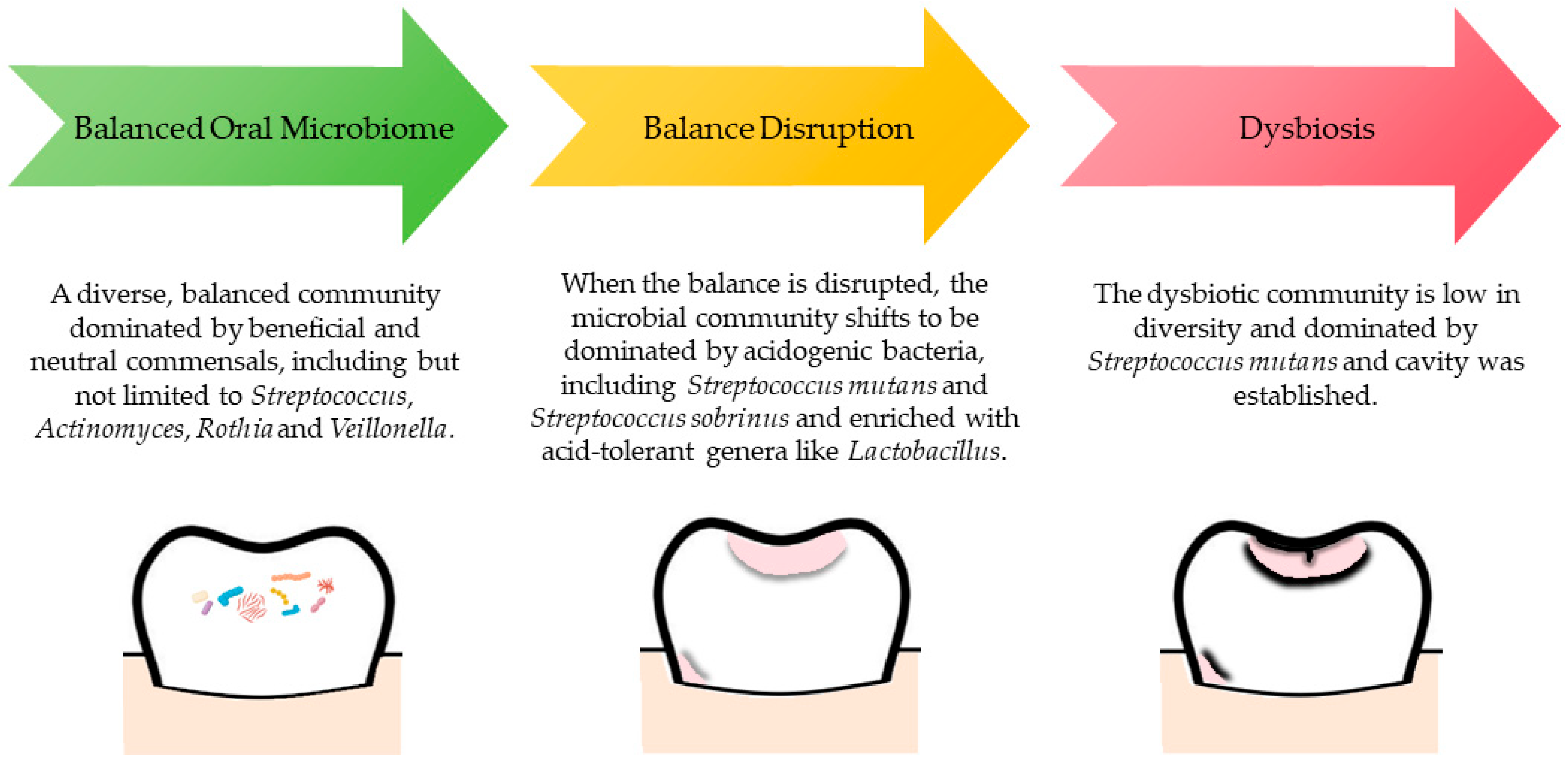 - Spatafora, G.; Li, Y.; He, X.; Cowan, A.; Tanner, A.C.R. The Evolving Microbiome of Dental Caries. Microorganisms 2024, 12, 121. [Google Scholar] [CrossRef]
