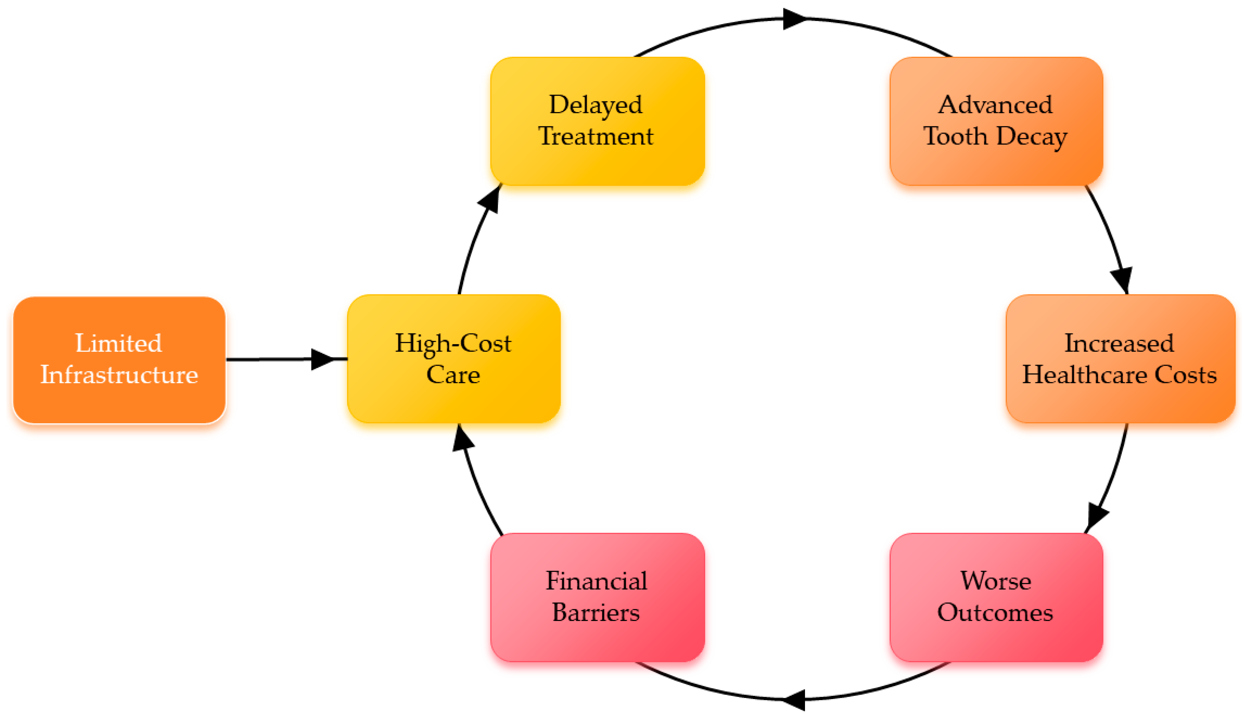 | Financial Hurdles | High out-of-pocket costs and exclusion from insurance plans. | Care avoidance resulted in worsened oral health in marginalized groups [32]. |