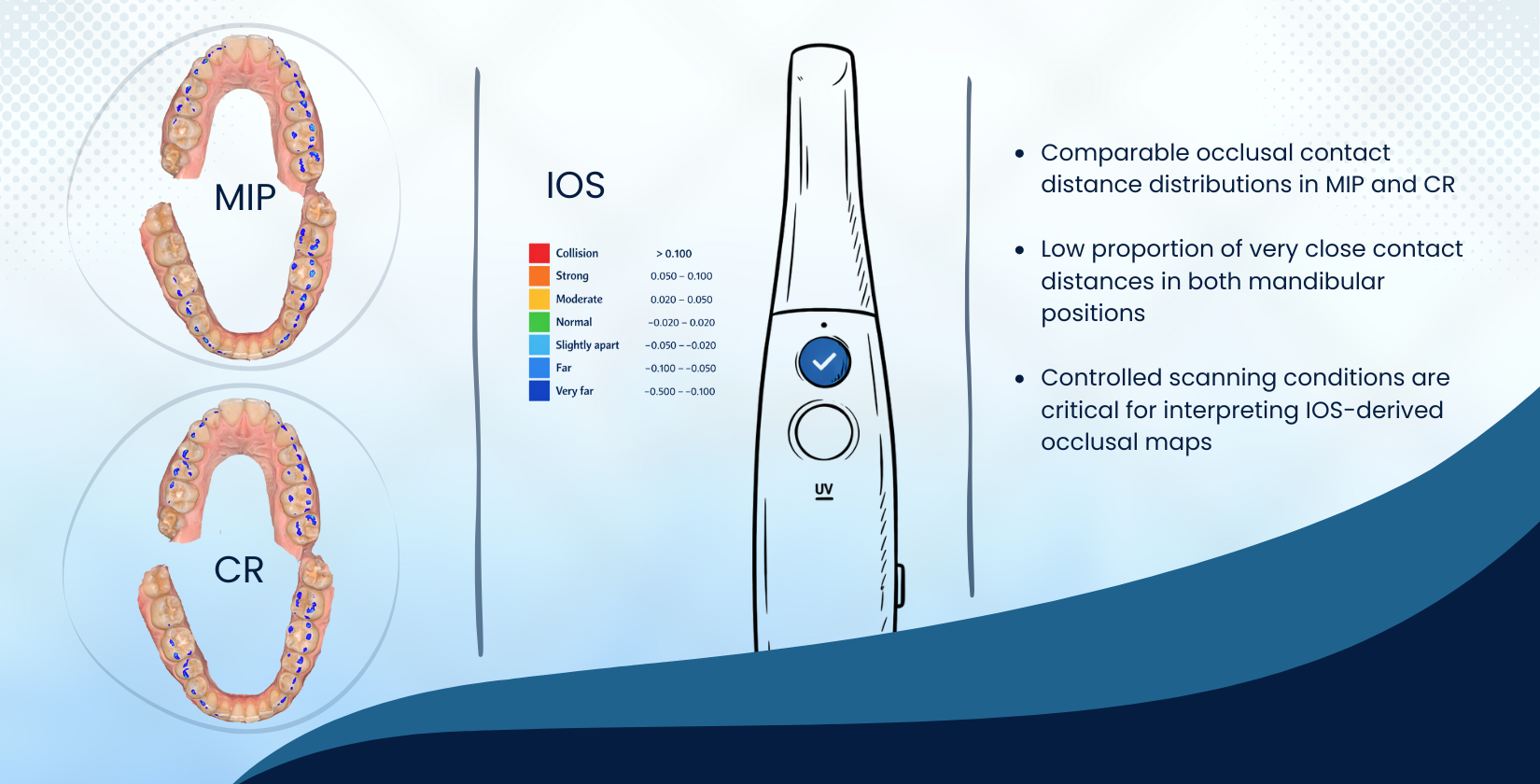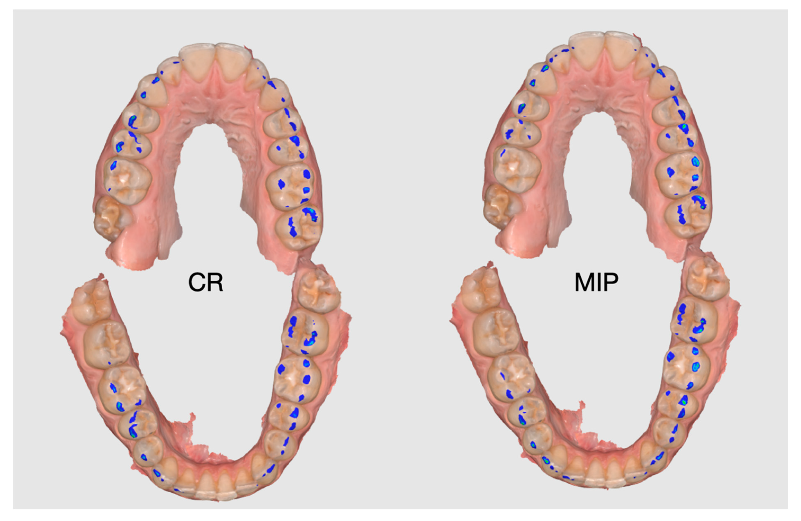Finally, the cross-sectional design restricts conclusions regarding the temporal stability of digital bite registrations. The present study evaluated CR and MIP at a single time point, without repeated scans to assess intra-session or iner-session variability. Longitudinal investigations incorporating repeated registrations and correlation with clinical outcomes are needed to further elucidate the stability and clinical relevance of IOS-derived occlusal contact distance maps.