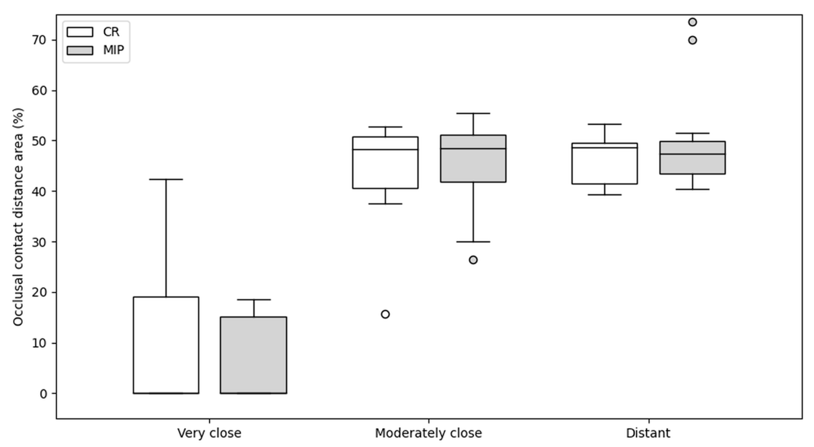 These findings suggest that, under the applied scan quality control criteria—specifically the exclusion of scans exhibiting excessive virtual overlap (>0.1 mm)—very close contact distances were not disproportionately represented in either CR or MIP. Similar distribution patterns have been reported in previous studies evaluating digital occlusal analysis workflows, in which the majority of detected contacts correspond to moderate or greater interocclusal separation, while very close contact distances account for a smaller proportion of the overall occlusal surface [