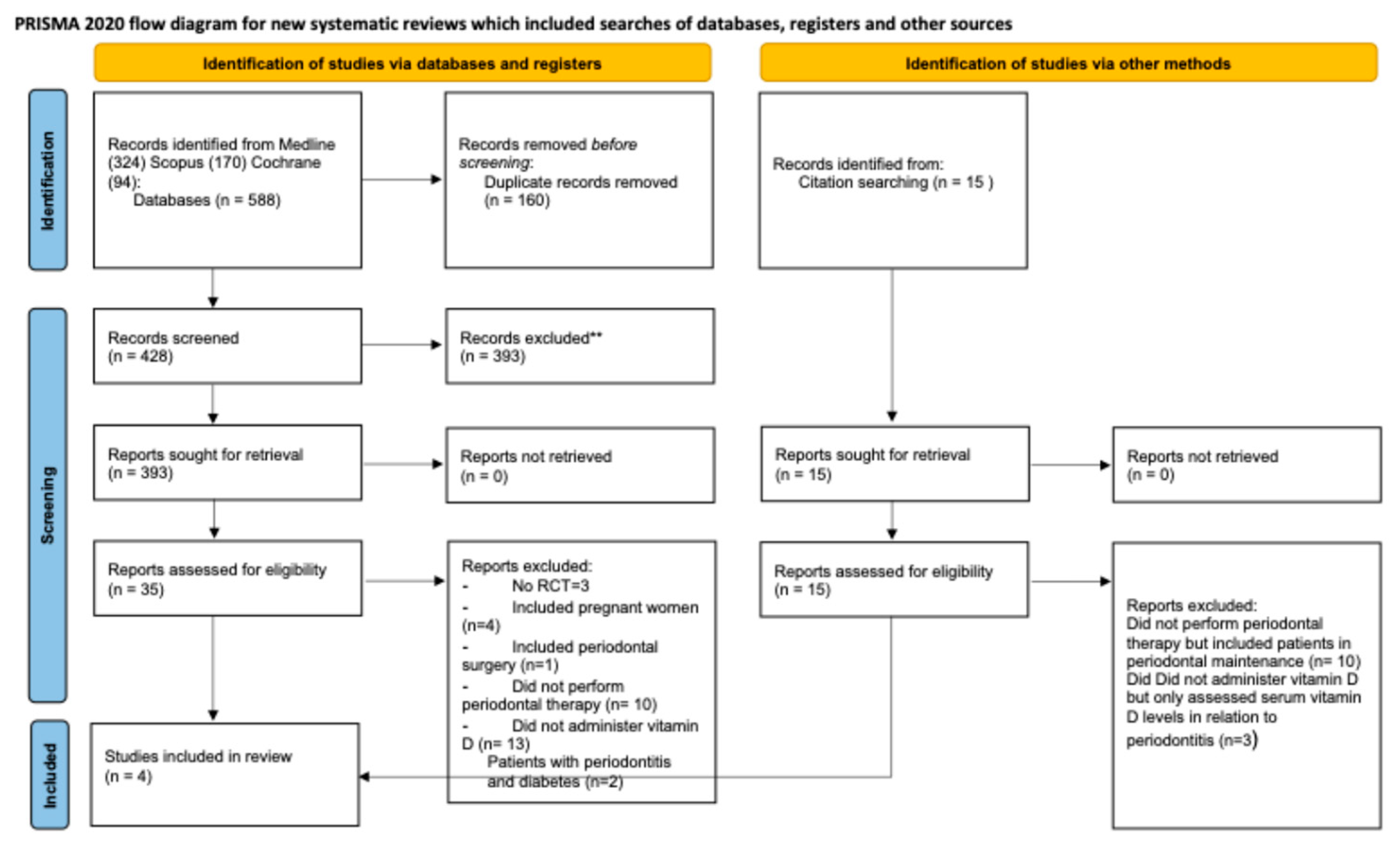 | Weimin Gao et al. 2020 [21] | RCT | 360 | Supragingival and subgingival scaling and root planing (SRP) followed by oral vitamin D3 supplementation (1000 or 2000 IU/day for 3 months) | SRP followed by placebo capsules | J 3 months | K Serum 25(OH)D, PD, AL, BI, PLI, ACH |