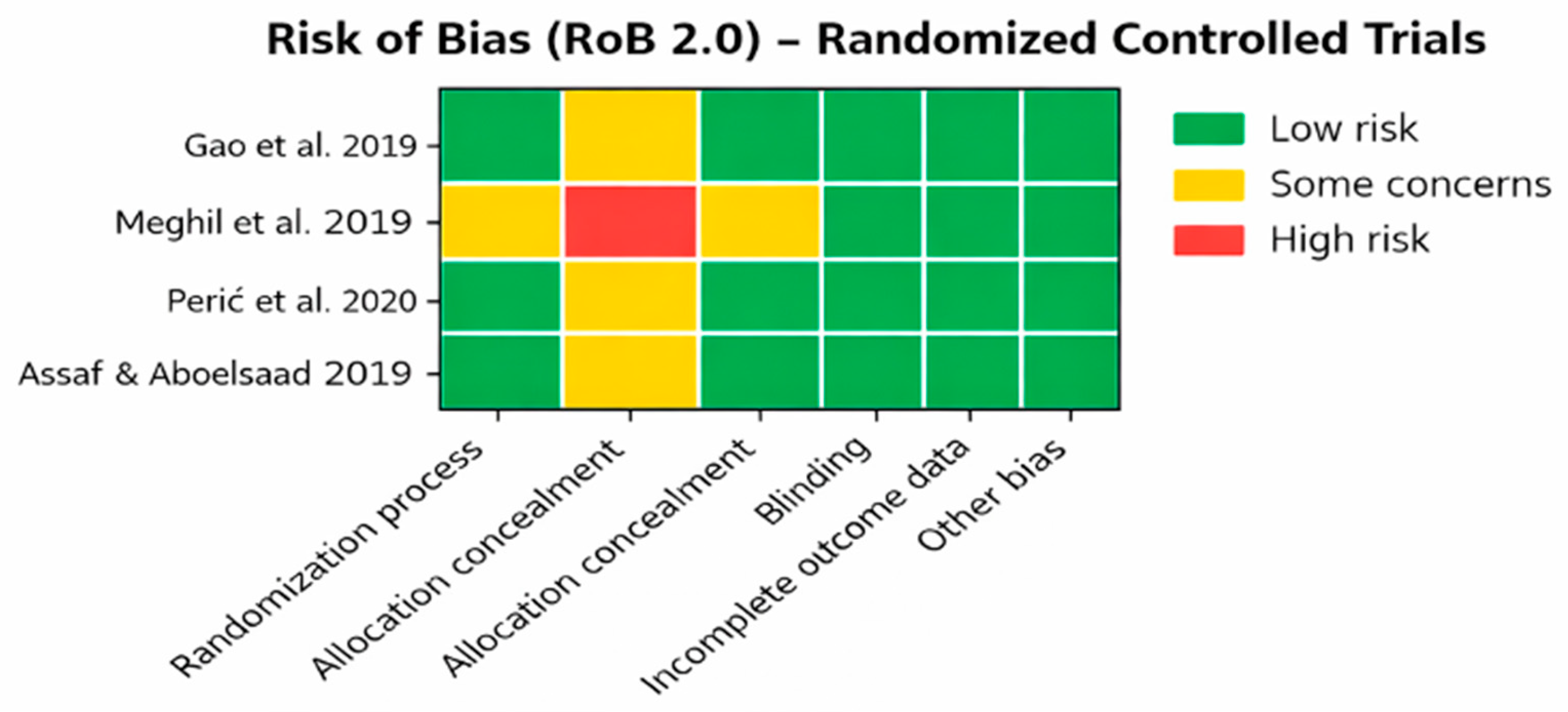 | Assaf and Aboelsaad 2019 [19] | RCT | RoB 2.0 | Low | Unclear | Low | Some concerns |