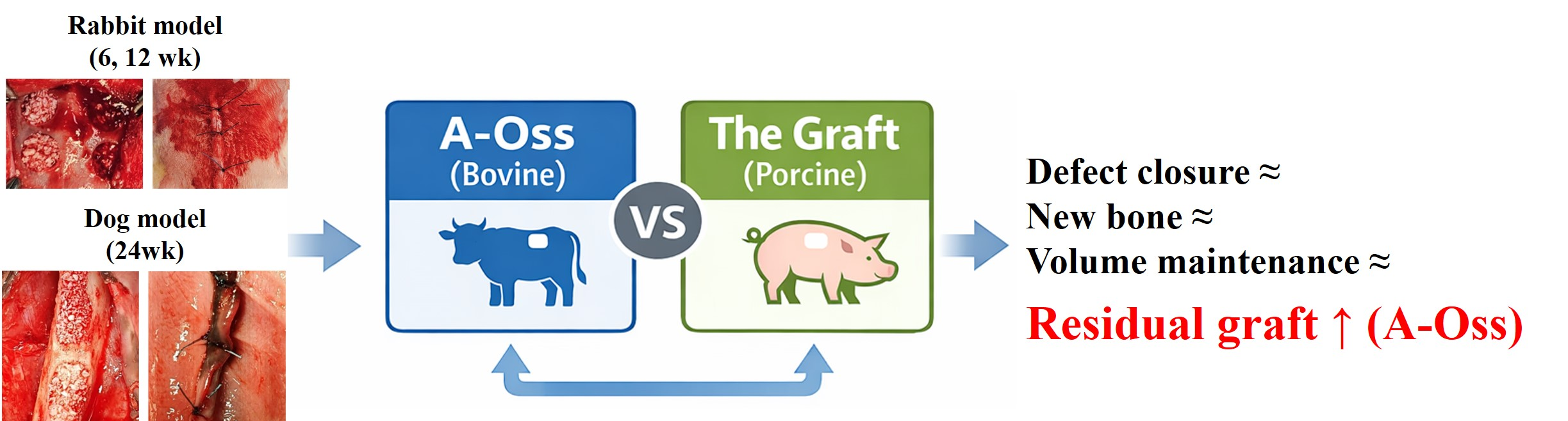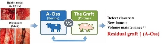 This study compared two xenogeneic bone substitutes (A-Oss and The Graft) using a rabbit calvarial defect model with 6 mm circular defects evaluated at 6 and 12 weeks, and a canine mandibular dehiscence-type defect model assessed at 24 weeks. Both materials function primarily as osteoconductive scaffolds, and recent clinical trials comparing porcine- and bovine-derived xenografts in augmentation procedures have reported broadly comparable histomorphometric and radiographic outcomes, though endpoint definitions and defect characteristics can influence the magnitude of observed differences [