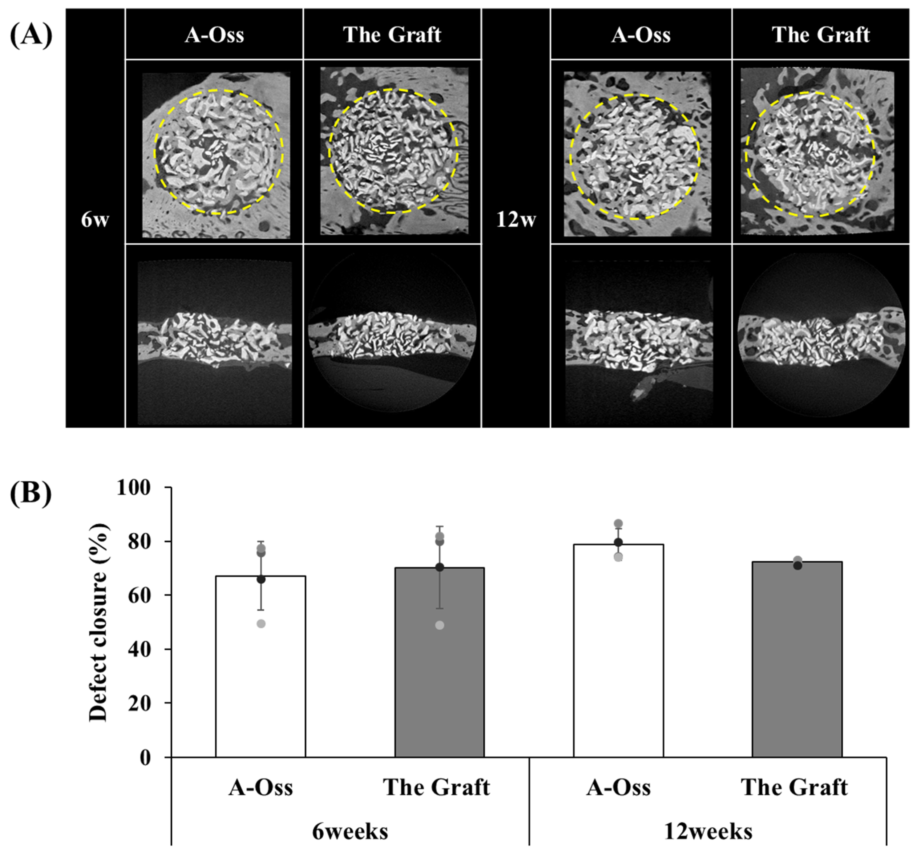Four circular defects (6 mm in diameter) were created in the rabbit calvarium. Within each rabbit, two defects were randomly allocated to A-Oss and two to The Graft in a split design, enabling within-animal paired comparisons. The defects were filled with the assigned graft material, and specimens were collected after 6 or 12 weeks of healing for micro-CT imaging and H&E histology [