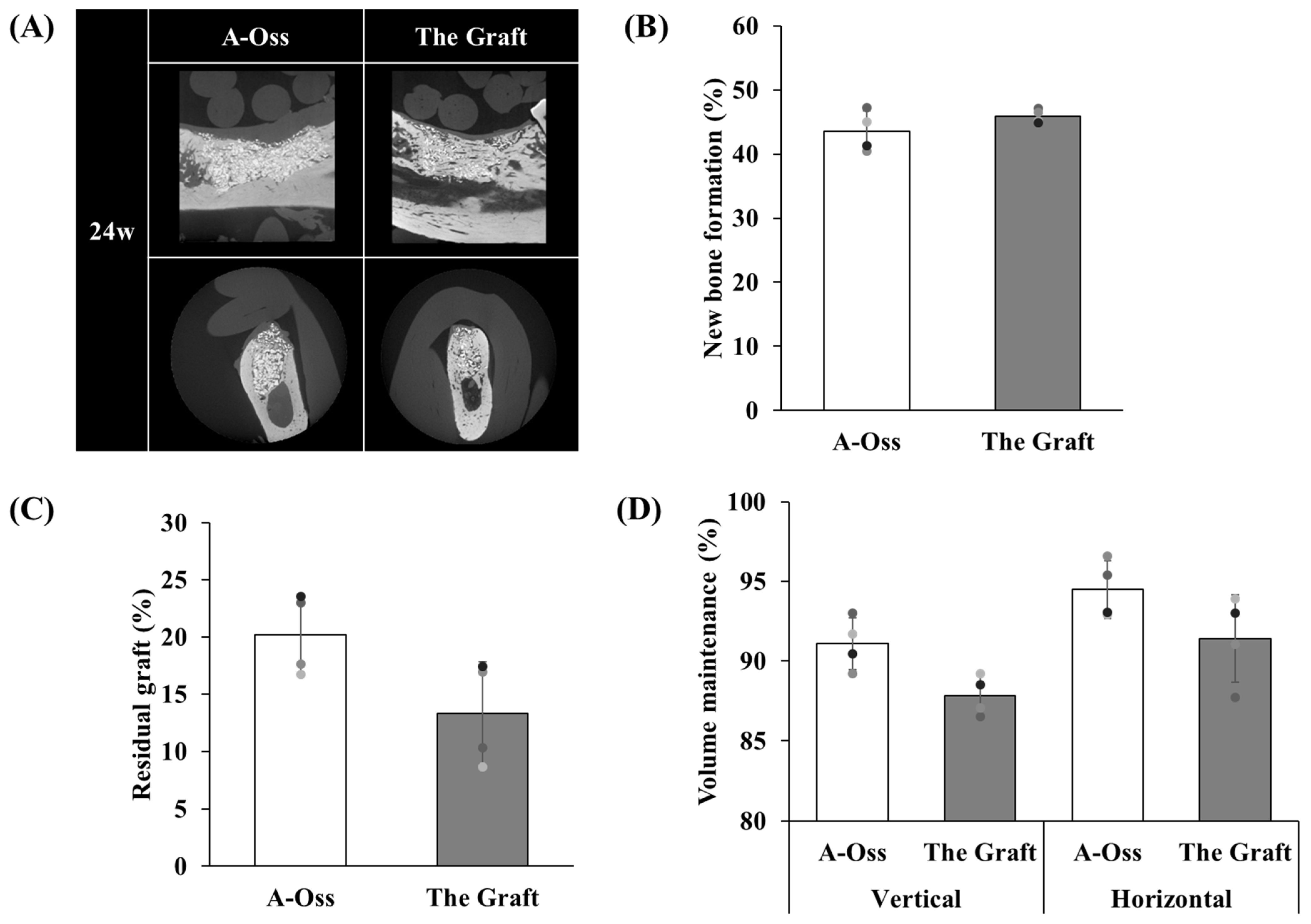 Across two preclinical models, A-Oss and The Graft produced comparable defect closure in rabbit calvarial defects and similar new bone formation in canine mandibular dehiscence defects at the evaluated time points. Residual graft percentage and vertical volume maintenance showed modest numerical differences favoring A-Oss, but these did not reach statistical significance in two-tailed paired Student’s t-tests.