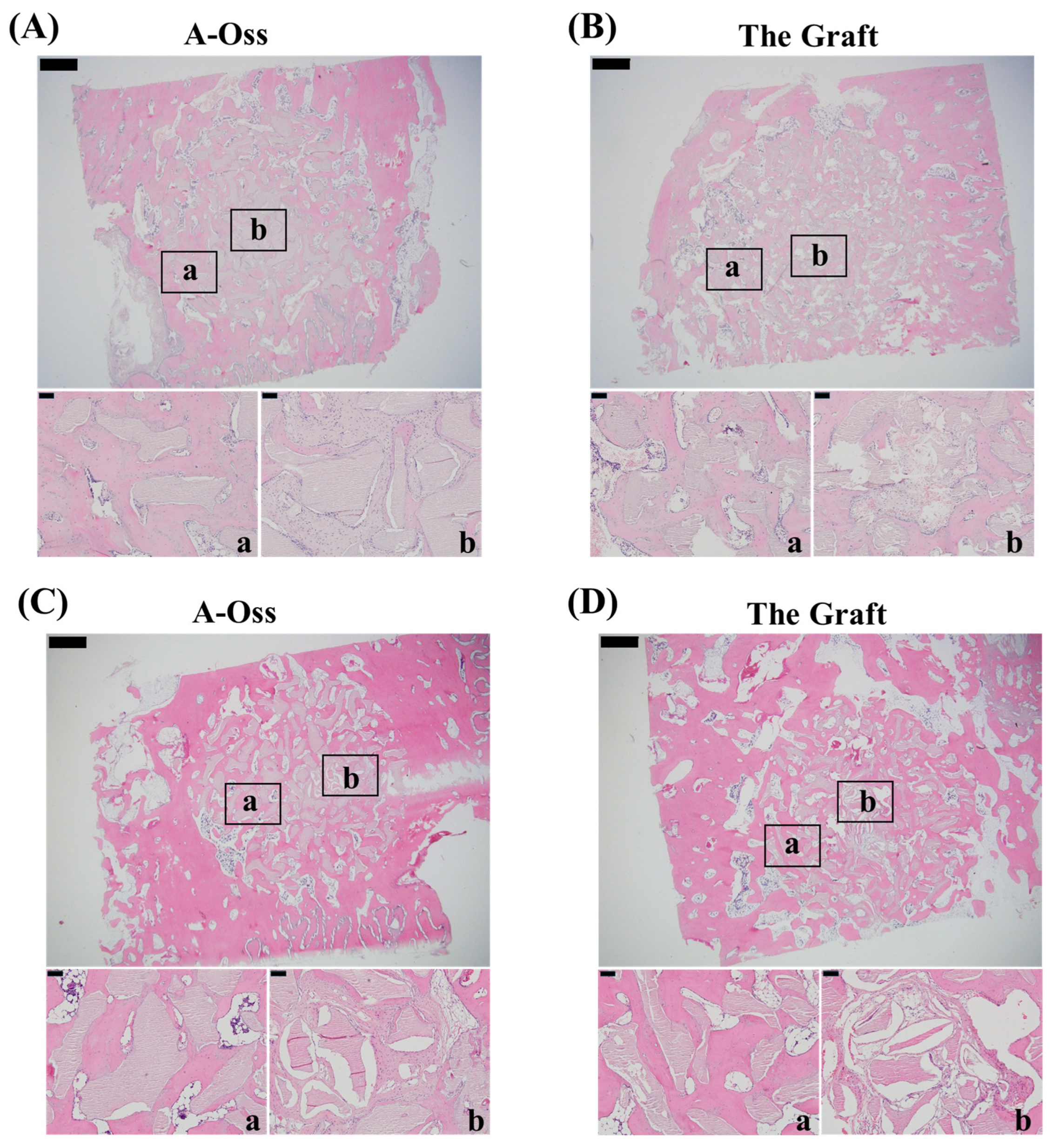 Two xenogeneic bone graft materials were evaluated: A-Oss (Osstem Implant, Seoul, Republic of Korea) and The Graft (Purgo Biologics Inc., Seongnam-si, Republic of Korea). According to the manufacturers, the particle size range of A-Oss and The Graft was approximately 250–2000 μm and 250–2000 μm, respectively. The materials were applied to surgically created defects according to the protocols described for each model. In both models, outcome variables were assessed at the pre-specified healing periods, and analyses were conducted on harvested specimens.