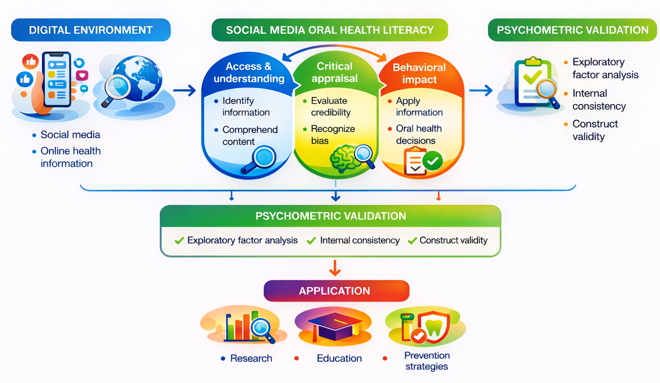 In this context, the Social Media Oral Health Literacy Questionnaire (SMOHLQ) was developed to evaluate oral health literacy in relation to social media use. At present, no standardized questionnaire specifically examines how oral health information available through social media is accessed, understood, critically appraised, and reflected in individual health-related behaviors. The instrument structure was guided by established theoretical frameworks of digital health literacy and oral health literacy, particularly the eHealth Literacy Scale (eHEALS) and the Digital Health Literacy Instrument (DHLI), which describe literacy as a set of competencies that include identifying relevant content, understanding its meaning, evaluating the reliability of sources, and applying knowledge when making health-related decisions. Based on these models, the items were formulated to reflect the particular features of social media environments, such as the predominance of multimedia content, variability in the quality of online materials, and the potential influence of digital content on oral health behaviors [