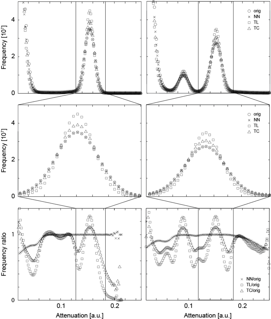 The attenuation histograms of the registered μCT datasets differ from the one of the original data. For the original data and the three interpolation methods, i.e., nearest neighbor (NN), the tri-linear (TL), and the tri-cubic (TC), the histograms of the entire volumes (top) and histograms related to enamel (middle) are displayed. For the plots in the bottom row, the point-wise ratio between the histograms of the interpolated and original data was represented. For the two crown pieces (left and right column, respectively) the NN interpolation does much less influence the histogram than the TL and TC interpolation procedures. Thus, the NN algorithm is selected for the joint histogram analysis, see below.