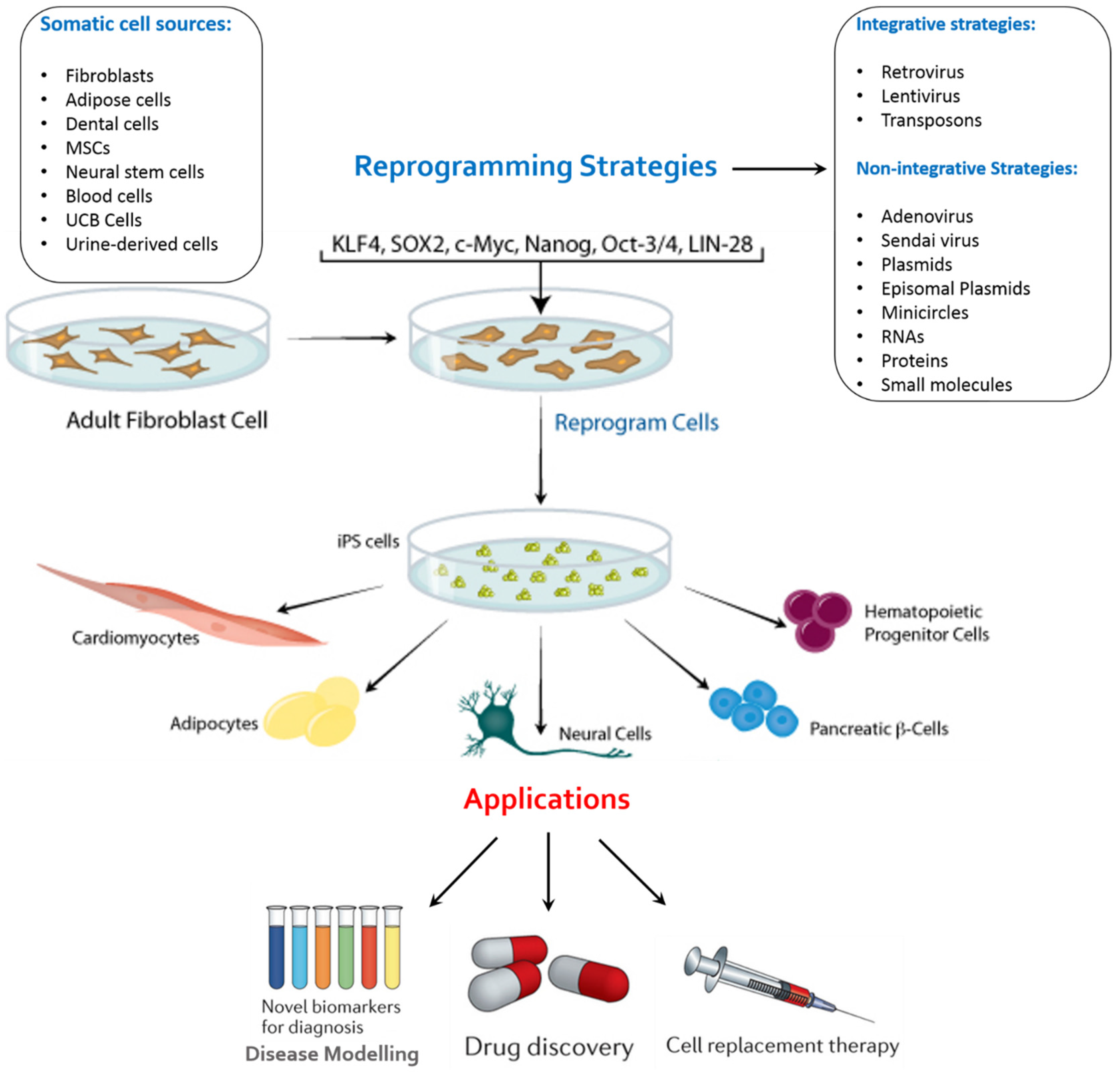 An overview of key reprogramming methods available for the generation of iPSCs from various somatic cell sources and their possible applications. Adult stem cells or iPSCs can be expanded in culture and differentiated into the disease-affected cells that can be used to recapitulated disease pathogenesis in vitro. Patient-specific disease models can be used to identify new biomarkers for improved diagnostic procedures, such as earlier detection of disease onset. These disease models can also be used to identify compounds that alleviate disease pathology in vitro, which can be further developed into novel drugs. Such compounds can be identified by carrying out a phenotypic screen using the disease model to identify compounds that may act through novel mechanisms. Stem-cell-derived cells can also form the basis for cell replacement therapies.