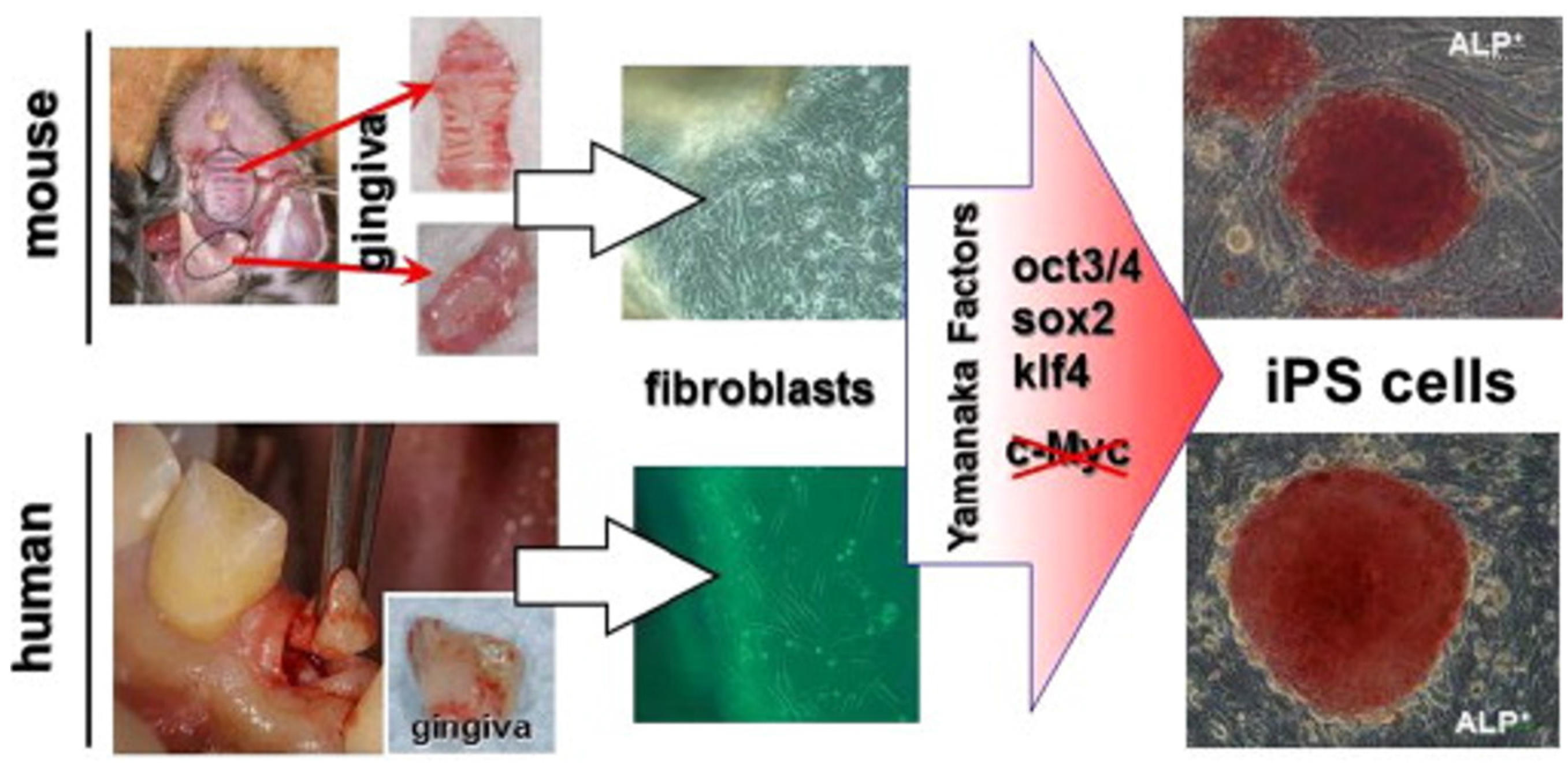 Generation of iPS cells from gingiva [138]. Gingival tissues from adult mice and patients (resected during dental implant surgery) can be used for iPS cell generation. Isolated gingival fibroblasts were easily reprogrammed by the transduction of three factors (Oct3/4, Sox2, and Klf4) without the c-Myc oncogene. Red iPS colonies in the figure show robust staining for alkaline phosphatase (ALP), which is associated with undifferentiated pluripotent stem cells. This figure is reproduced from the study by Egusa et al. [137] under open-access license policies.