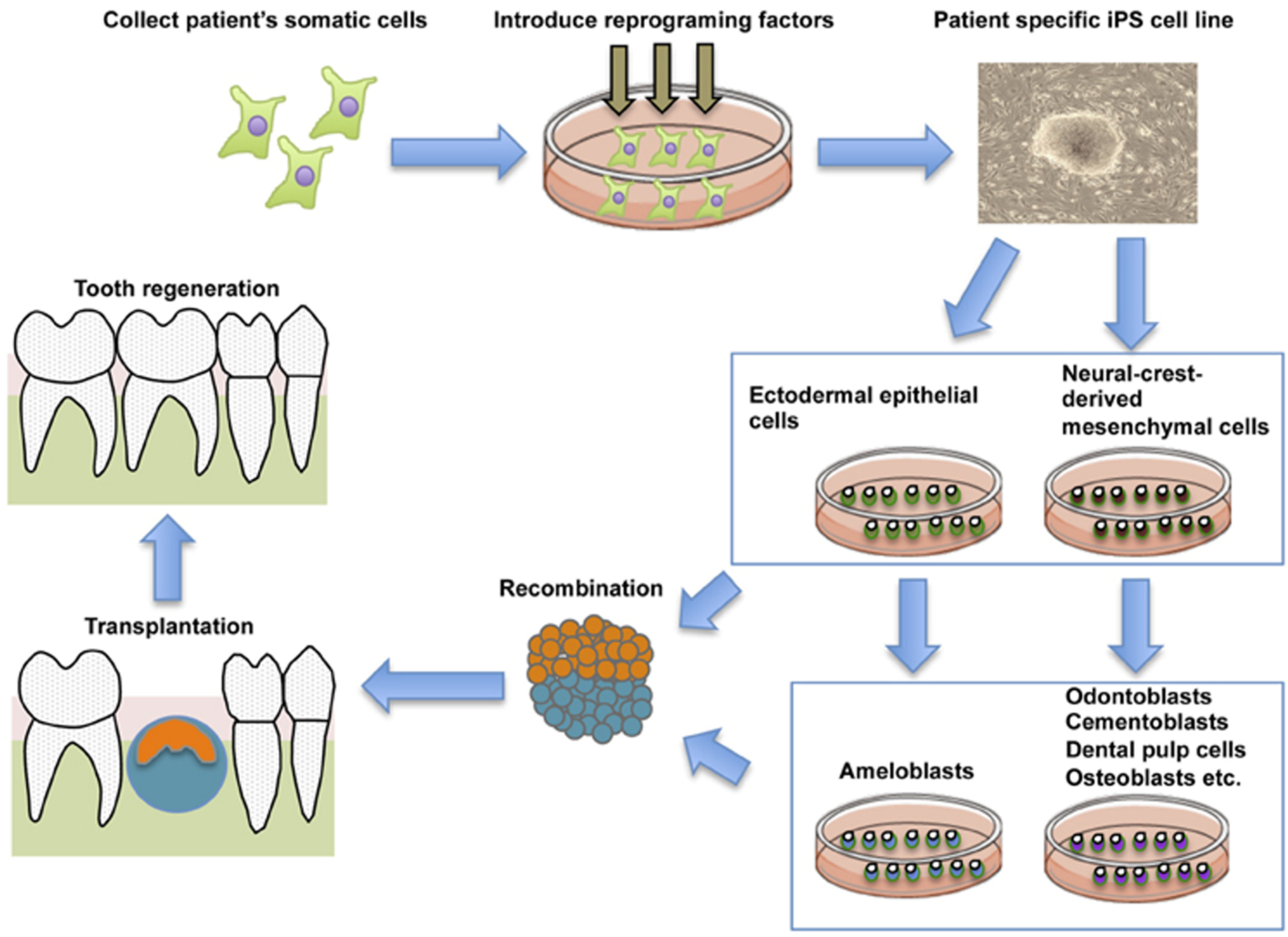 General schematic representation of the current strategy for whole tooth regeneration using iPSs. The patient’s somatic cells are harvested. Reprogramming conditions/factors are introduced to induce self-renewal and pluripotency, and patient-specific iPSCs are established. iPSCs are induced to form ectodermal epithelial cells and neural crest-derived mesenchymal cells, and they are further induced to form odontogenic cells in vitro. The two cell populations are combined by direct contact, mimicking the in vitro arrangement. Interaction of these cells leads to formation of a nearly-stage tooth germ. Once transplanted into the mouth, the recombinants develop and lead to functional recovery from tooth loss. This figure is reproduced from Otsu et al. [148] under open-access license policies.