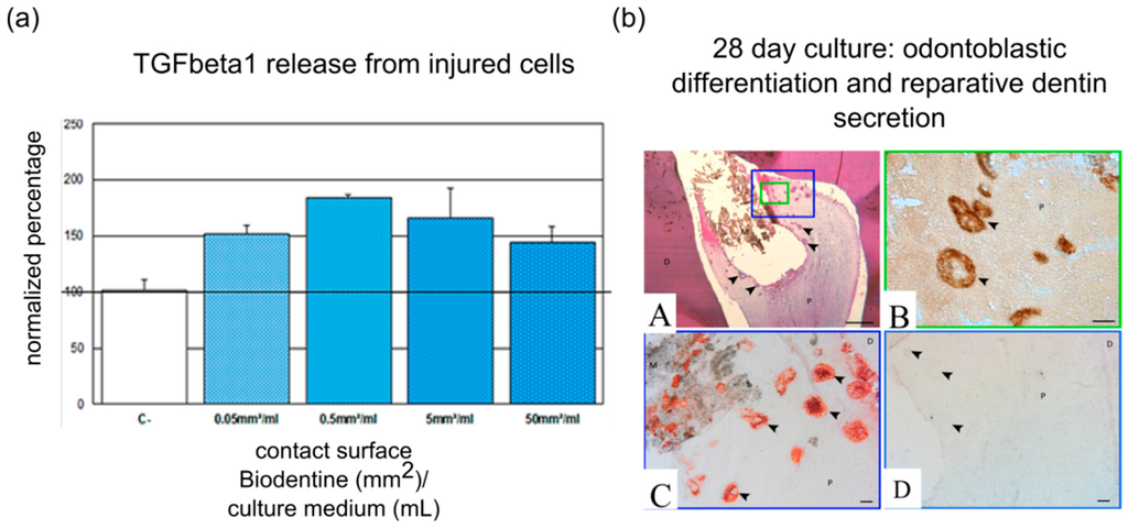 Biodentine and its effect on dental pulp regeneration. (a) Regardless of surface area, Biodentine induces TGFβ-1 release, a major chemoattractant for DPSC, from injured pulp cells; (b) Expression of odontoblast markers after pulp capping with Biodentine in entire tooth culture model. Numerous mineralization foci (arrowheads) can be viewed beneath the biomaterial after culture for two weeks and hematoxylin and eosin staining (A). Dentin sialoprotein (B) and nestin (C) are expressed in the mineralized foci, which represent an early form of reparative dentin (D). Abbreviations: D, dentin; P, pulp; M, biomaterial. Scale bars: A = 500 µm; B,C,D = 100 µm. Modified with permission from [].