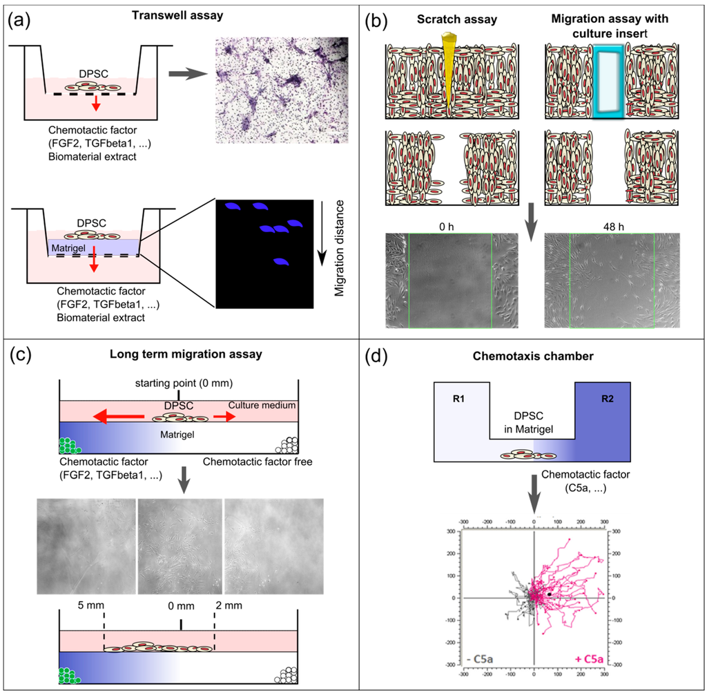 Schematic overview of the different in vitro assays used to study DPSC recruitment and migration. (a) On the upper panel, a classical Trans-well assay used to evaluate the chemotactic potential of bioactive molecules and biomaterials (extracts), with cells seeded on the upper side of the membrane. Results are obtained by swabbing the non-migrated cells from the upper side of the membrane followed by histological staining of the migrated cells on the lower side of the membrane. These can be counted and quantified. On the lower panel, a modified Trans-well assay where the porous membrane is coated with an extracellular matrix (ECM)-like gel (e.g., Matrigel, collagen), on which cells are seeded. Gels can be retrieved to evaluate the migrated distance of cells (e.g., by cell nuclear staining using 4’,6-diamidino-2-phenylindole (DAPI) (blue) and confocal microscopy); (b) On the left, scratch assay to evaluate cellular migration. A scratch is made (usually using a pipette point) on confluent cell cultures. On the right, a modified assay to study cellular migration is represented. A culture insert is placed, around which cells are cultured. When the culture is confluent, the insert is removed leaving behind a reproducible cell-free zone with sharp borders, as opposed to the scratch assay. With both techniques, cellular migration into the cell-free zone is followed up microscopically and can be quantified using specialized software. A chemotactic gradient is absent in these assays; (c) Culture model to study long-term migration following the controlled release of chemotactic factors. Poly(lactic-co-glycolic acid) (PLGA) microspheres with or without chemotactic factors are embedded in Matrigel in a graduated tissue culture chamber. DPSC are seeded in the middle and their migration can be followed microscopically over long time periods (up to 10 days); (d) Specialized in vitro chemotaxis chamber. A stable chemotactic gradient is established by injecting a solution of chemotactic factor in one of the reservoirs. Cells are seeded in the observation area containing Matrigel in the middle of the chamber. Real-time monitoring of cellular migration can be performed up to 48 h. Quantitative evaluation is carried out by specialized software. Individual cells are tracked and the center of mass (CAM) is calculated. Trajectory plots can be presented graphically.