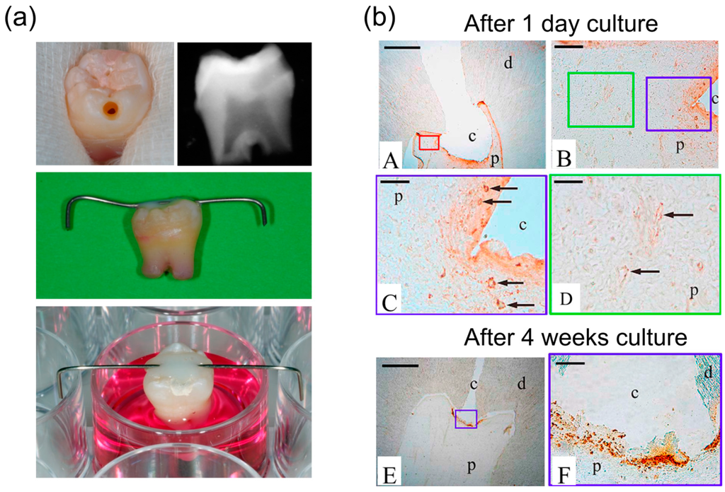 Overview of the ex vivo tooth model and its application for studying DPSC migration. (a) The pulp cavity was prepared in a clean immature third molar. X-ray imaging showed that the cavity is reaching the pulp. After cavity preparation, teeth were suspended with their root canals in culture medium with the aid of a steel wire fixed on the crown; (b) Representative histological images of teeth cultured with medium containing 5-bromo-20-deoxyuridine (BrdU) during one day after cavity preparation, followed with medium without BrdU for four weeks. After one day, the labelling was localized in the nuclei of cells in the perivascular area. The BrdU immunolabelling exhibited a gradient. It was strong in the blood vessels surrounding the cavity (B and C) and decreased in those away from the cavity (B, D). At four weeks, the immunolabelling was localized at the cavity area only (E and F). Abbreviations: c: cavity; d: dentin; p: pulp; arrows indicate vessels. Scale bars in (A, E) 1 mm; (B, F) 100 µm; (C and D) 50 µm. Modified with permission from [].