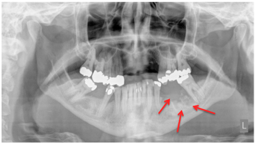 In a daily routine, a clinical examination and a radiograph are the minimum examinations required in order to detect lesions and to provide data for a follow-up appointment. For Marx et al., panoramic imaging is the image of choice for a routine dental assessment in these patients [13]. Figure 1, Figure 2 and Figure 3 exemplarily depict typical findings of panoramic radiographs.
