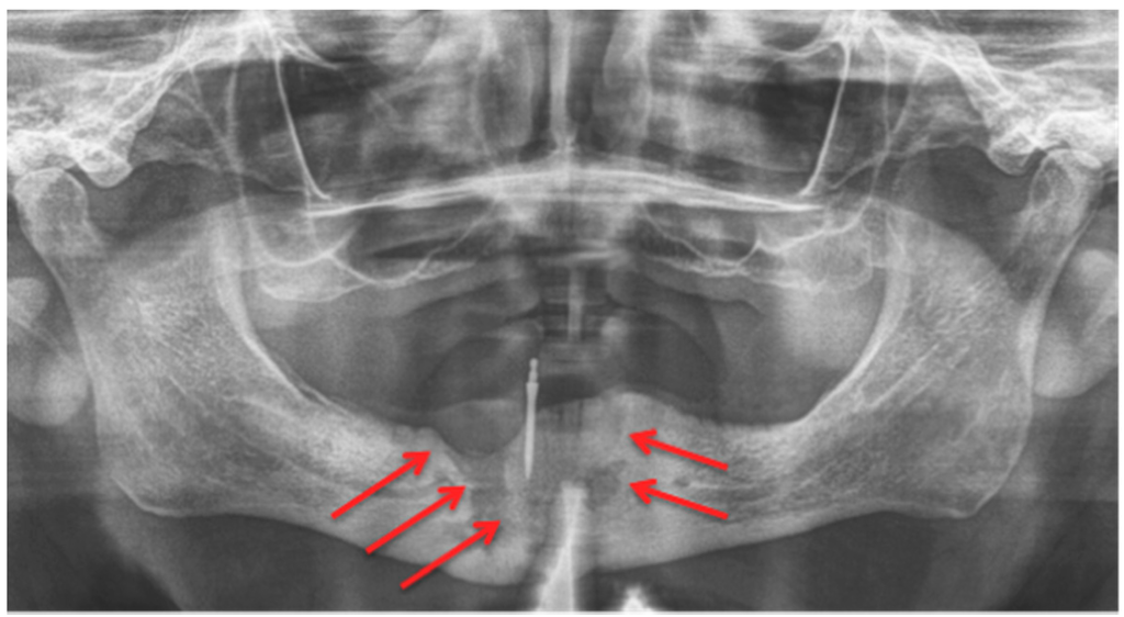 Panoramic radiograph: Patient: 77 years old, male, metastatic prostate cancer, ibandronic acid & later another antiresorptive drug: denosumab. Red arrows point to the necrotic area. Artefact due to thyroid shield. For the corresponding cone-beam computed tomography (CBCT) image, see Figure 4. AAMOS staging: stage 2.