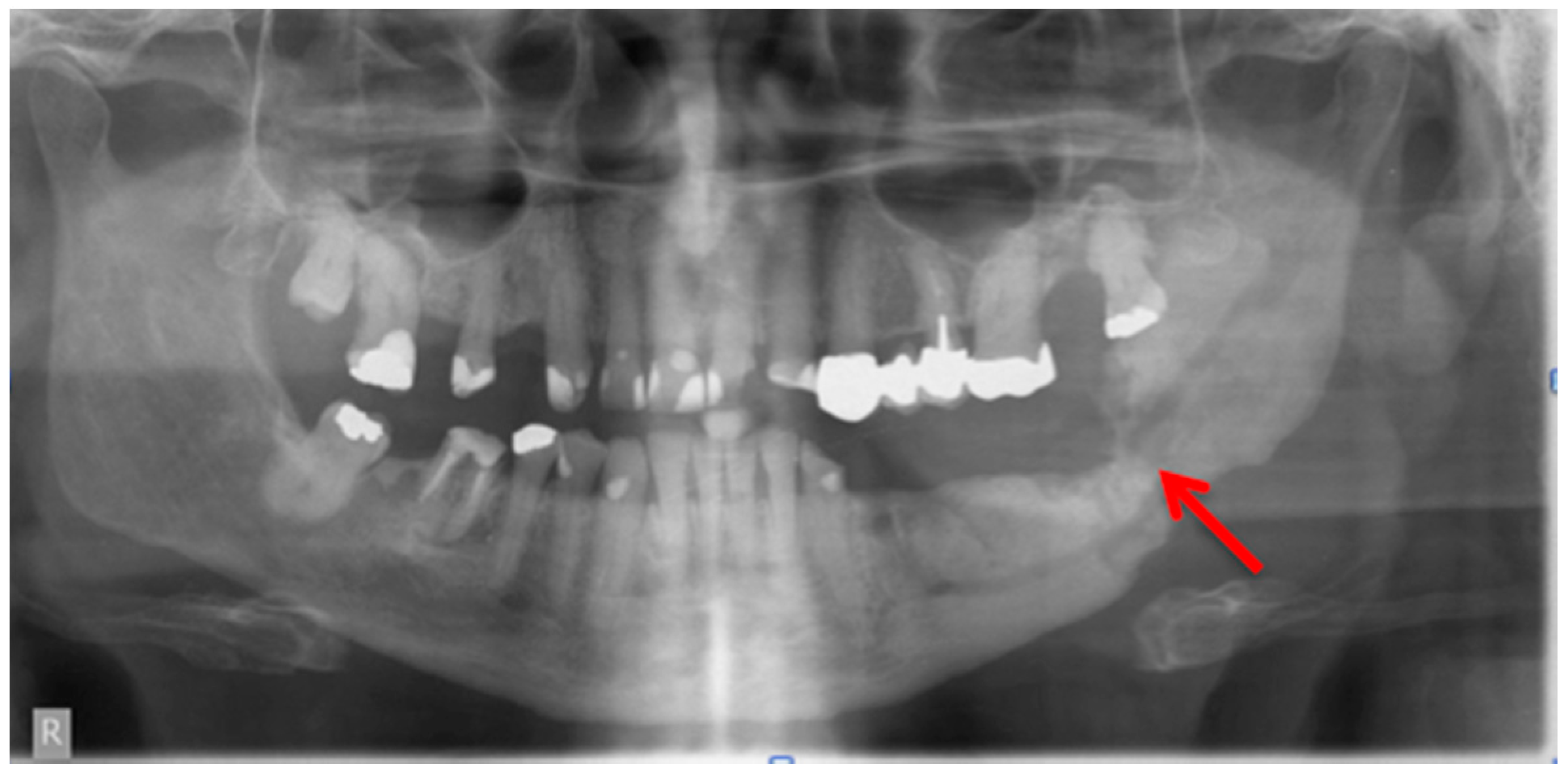 - Rocha, G.C.; Jaguar, G.C.; Moreira, C.R.; Neves, E.G.; Fonseca, F.P.; Pedreira, E.N. Radiographic evaluation of maxillofacial region in oncology patients treated with bisphosphonates. Oral Surg. Oral Med. Oral Pathol. Oral Radiol. 2012, 114, S19–S25. [Google Scholar] [CrossRef] [PubMed]